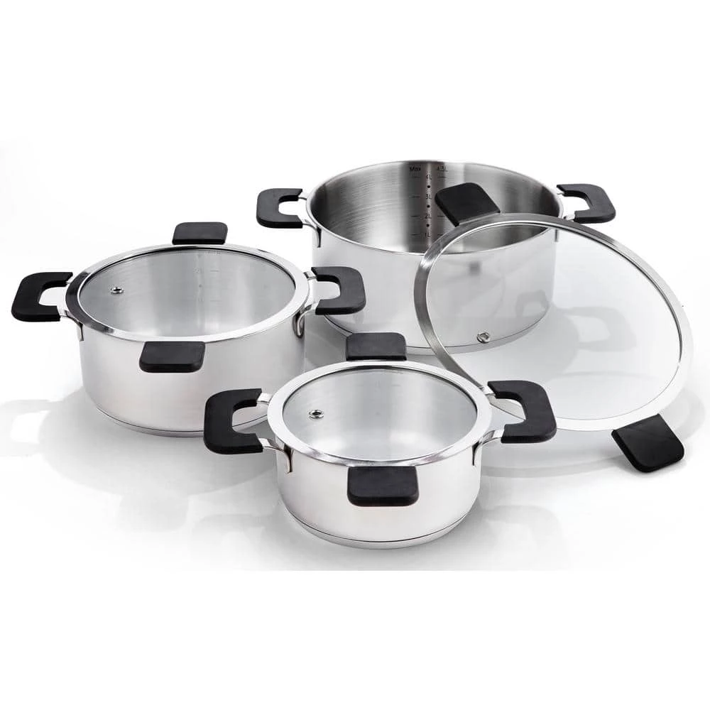 - Versatile and stackable set includes a 4.5 l (4.8 Qt.), 2.7 l (2.9 Qt.), and 1.3 l (1.4 Qt.) stainless steel pot, with Ozeris patent-pending straining and hands-free glass lids