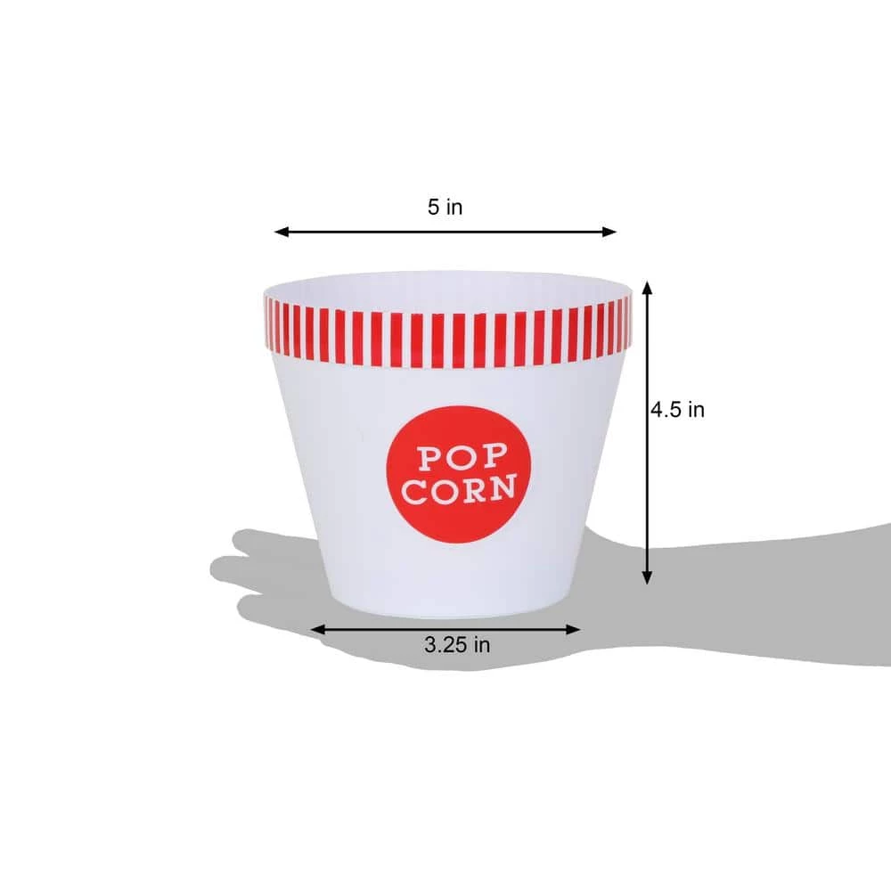 - 4 small red-rimmed popcorn tubs – the perfect way to share some holiday cheer. Each tub has a kernel separator and holds two cups of popcorn.