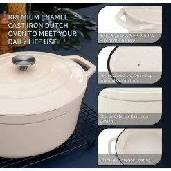 - Our enameled cast iron dutch oven uses 100% PFOA free, lead-free and cadmium-free enamel coating, and cast iron ecological materials, which is non-stick, anti-rust and anti-corrosion, easy to clean, and no retained flavors of food