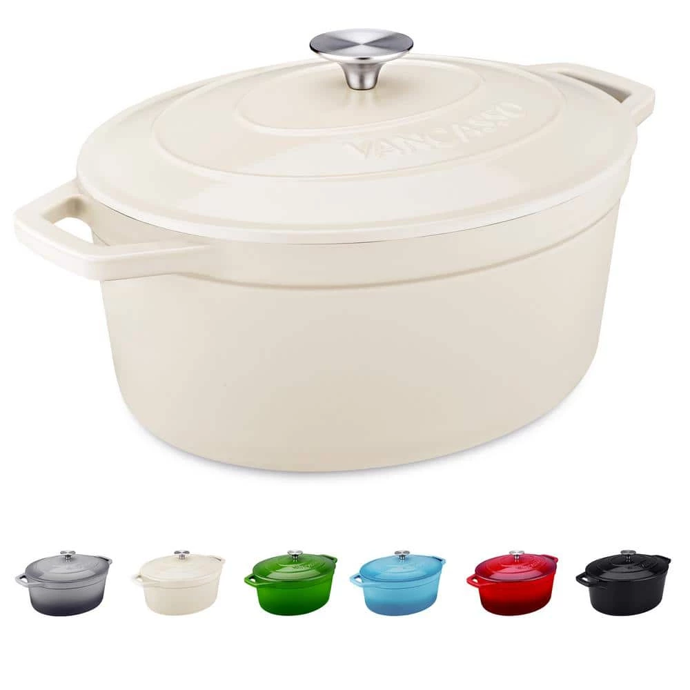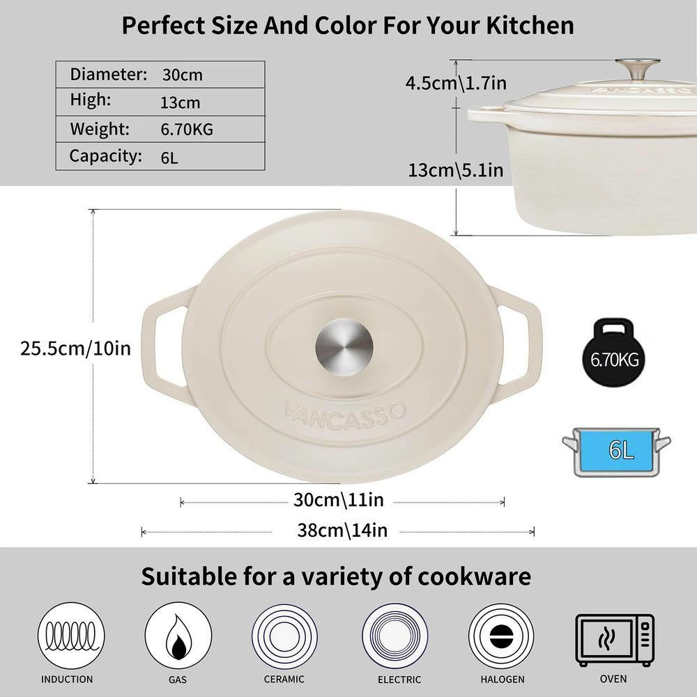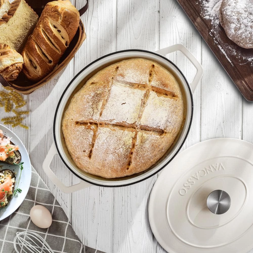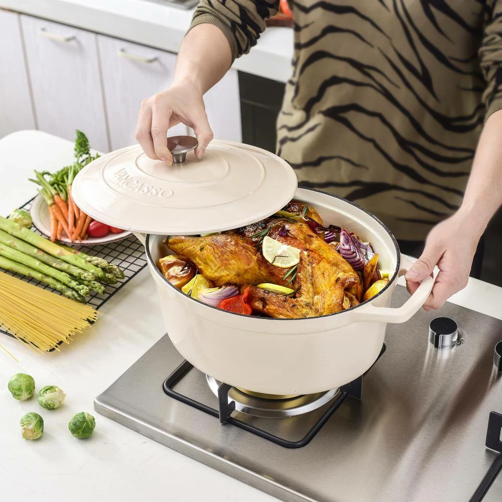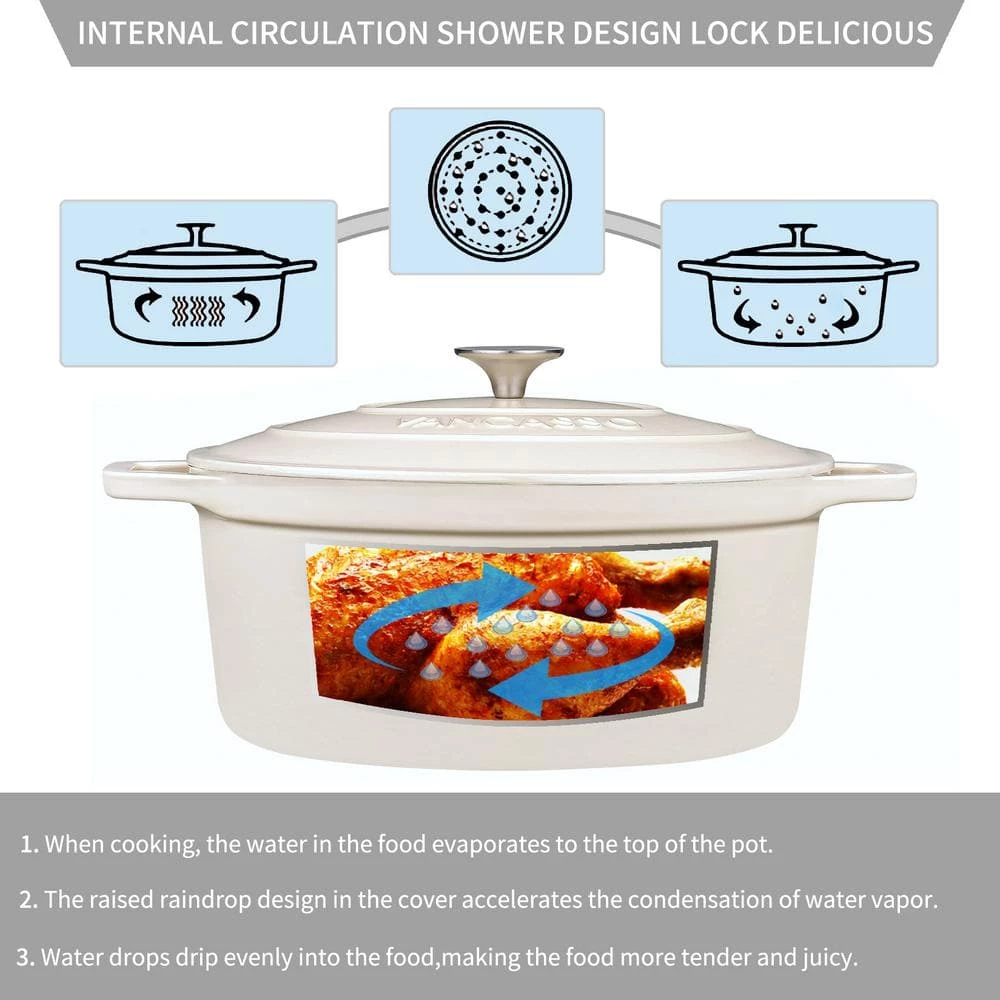 The enameled cast iron dutch oven with a self-basting Lid, ideal for delicious dinners for any occasion. The oversized handles and stainless-steel knob provide a sturdy grip for easy handling and carrying. Interior enamel has a smooth finish that promotes caramelization, prevents sticking, and resists stains. Ideal for roasting meat, slow cooking stews, baking bread and all kitchen tasks. You’ll enjoy a lifetime of healthy cooking with your vancasso cookware.