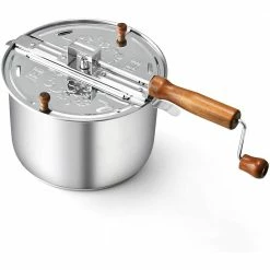 The Cook N Home 6 qt. stainless steel stovetop popcorn popper is made with stainless steel with an encapsulated aluminum Bottom. Aluminum layer bottom provides even heat distribution and prevents hot spots. Durable metal gears for stirring. Stainless steel lid has steam vents to keep popcorn crisp. Wooden handle and knob stays cool and is comfortable. Makes popcorn in a few minutes and is easy to pour. Mixes kernels so they do not stick or burn. Induction compatible and works on gas, electric, glass, ceramic, etc. Not dishwasher safe, wipe with cloth to clean.