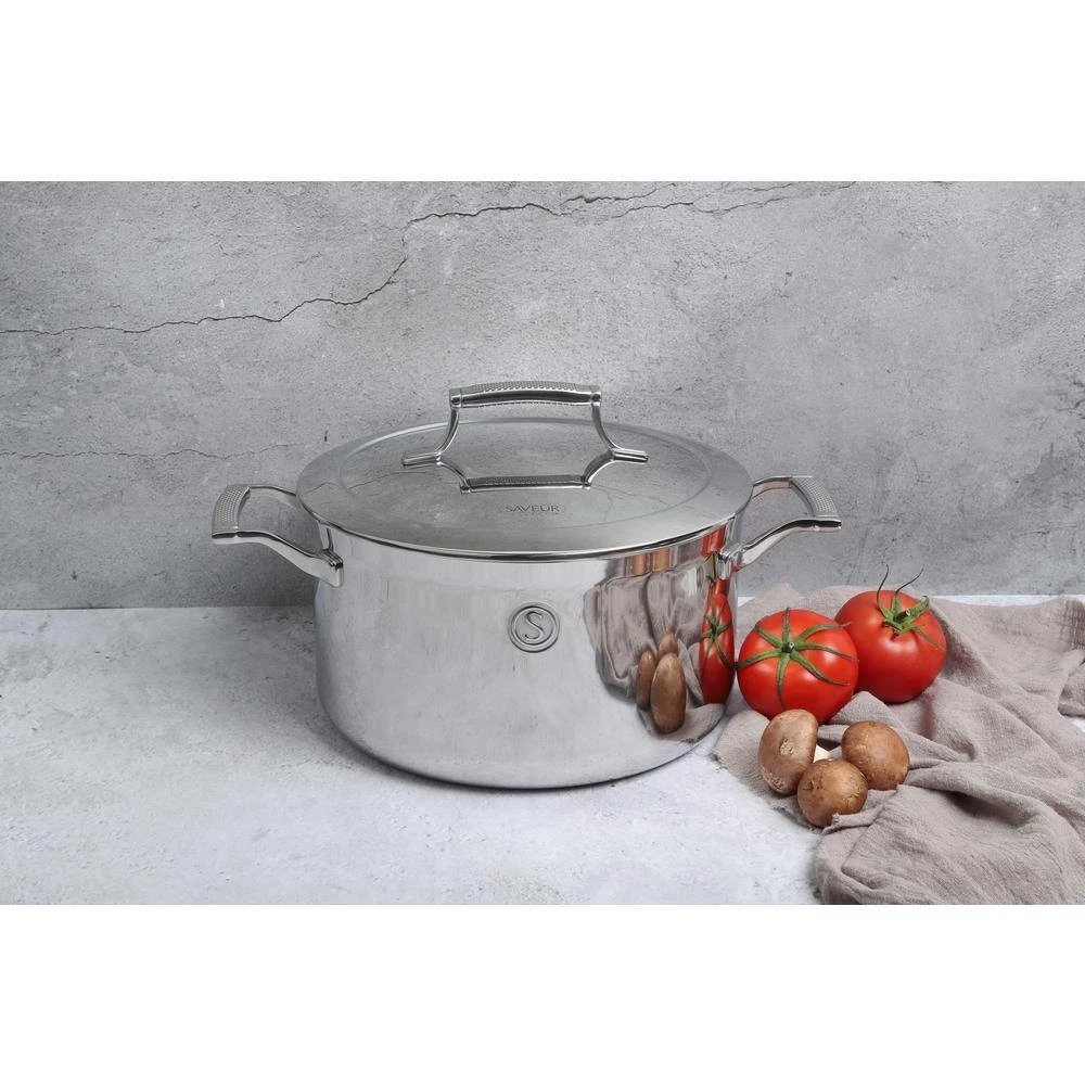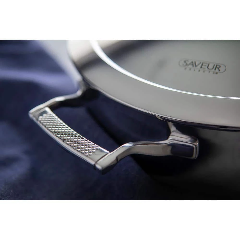 The SAVEUR SELECTS Voyage Cookware Collection brings affordable and stylish performance cookware to culinary explorers who love the art of cooking. The collection has been designed with multiple features to enhance the cooking experience from kitchen to table. Our cookware features Tri-Ply stainless steel construction, double walled lids, stay cool and non-slip handles.