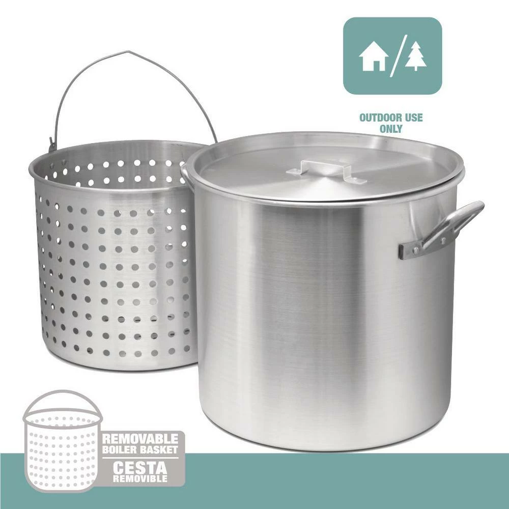 64 qt. Stockpot with aluminum body, removable perforated boiler basket with basket lifting handle and vented lid. Heavy Duty die cast riveted handles that provide a comfortable, safe and secure grip. Ideal for gumbos, soups, steamed foods, lobster boils, mussels, shrimp and crawfish.