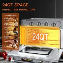 This 24 Quart capacity Air Fryer Toaster Oven allows you to prepare a family-sized dinner for up to 10 people! 50% faster than a conventional oven. 3 layers of heating allow you to cook more food at one time. Makes perfect chiffon cake, steak, a 12-inch pizza, 6 lbs chicken, 3 lbs French fries, 6 toast, bread, and veggies. (12.91″ tall 12.28″ deep 7.32 ” wide internal dimensions) (16.89″ tall 16.14″ deep 13.32″ wide external dimensions)