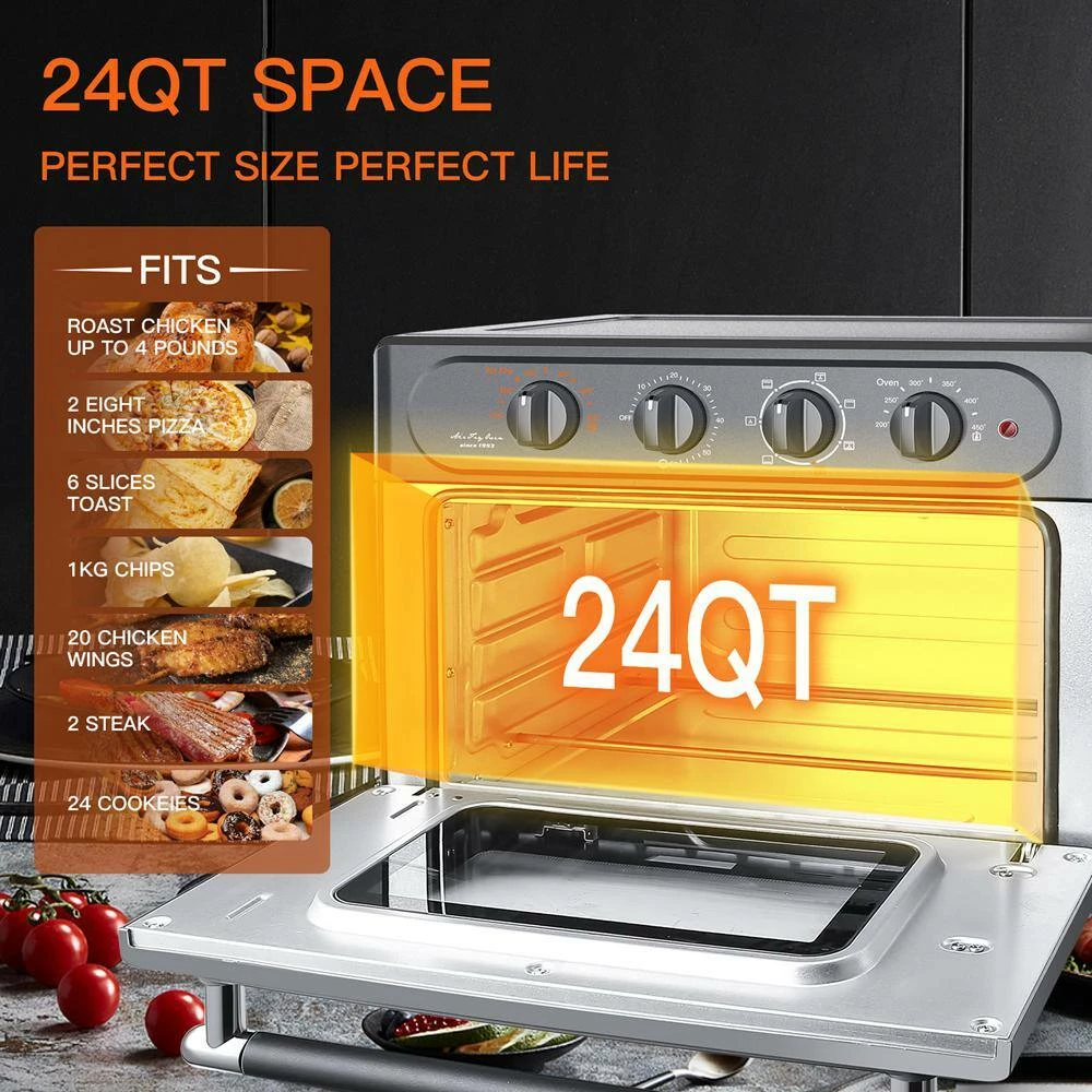 - This air fryer toaster oven includes 7 versatile presets: Air Fry, Toast/Bake, Roast, Broil, Defrost, Convection Broil, and Grill. All-in-One Air Fryer Oven. Accessories included: Air fryer basket, oven rack, baking pan, and drip tray. Easy to clean!