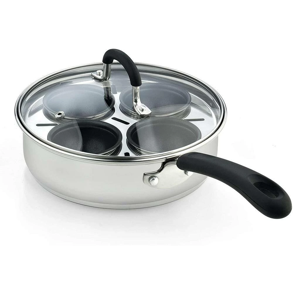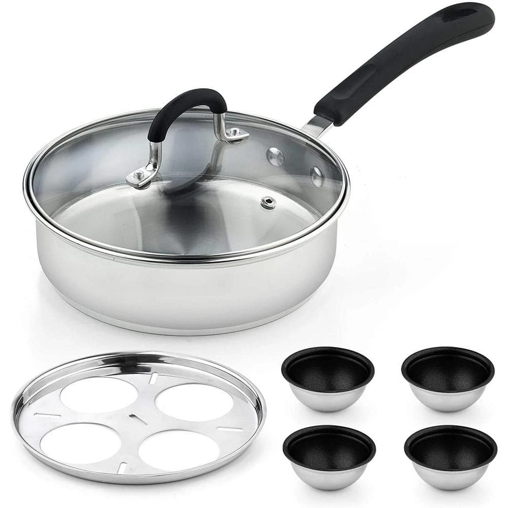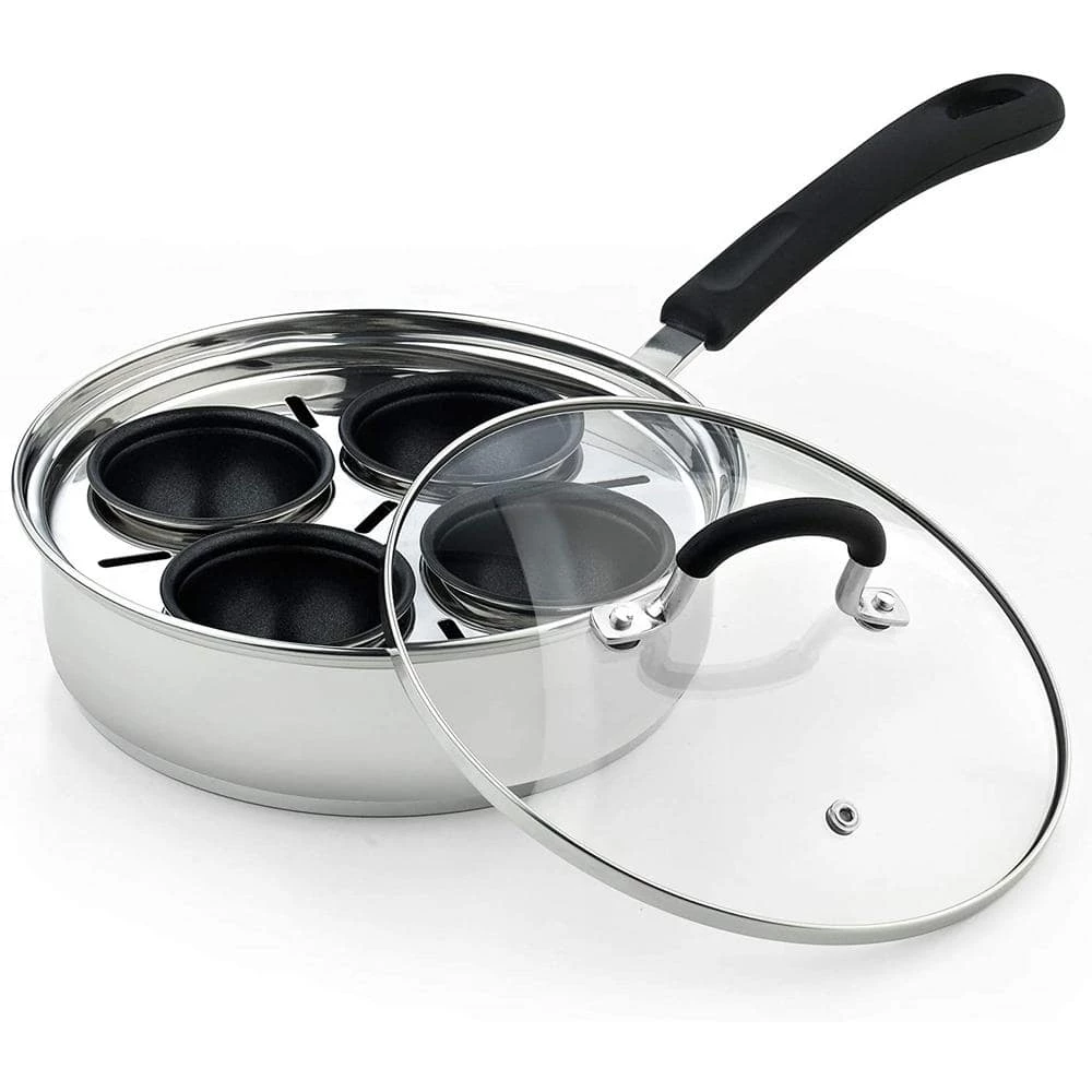 The Cook N Home 4 cup stainless steel egg poacher pan with lid, 8″ is durable, heats evenly, and prevents hot spots. 4 Non-Stick Cups holds 1 extra large egg each. Tempered glass lid with steam vent makes viewing food easy and keeps heat/moisture in. To use: fill pan with water, put eggs/food in cups, and cook to desired firmness. Cups can be removed to be used as a saute pan. Induction compatible. Works on: gas, electric, glass, halogen, ceramic, etc. Dishwasher safe, hand wash recommended.