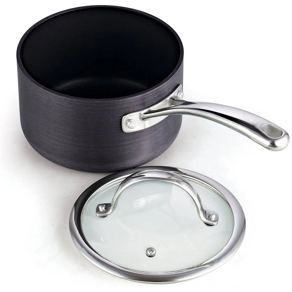 The Cooks Standard 8-Piece Hard Anodize Cookware Set in Black includes: 2 Qt. sauce pan with lid, 3 Qt. sauce pan with lid, 8 Qt. stockpot with lid, 8 in. and 10 in. fry pans. Items have an anodized surface that is durable and harder than stainless steel. Heavy gauge aluminum core distributes heat evenly and prevents hot spots. Nonstick coating delivers exceptional performance and makes cleaning easy. Lid is tempered glass that is protected by a stainless steel rim. Ergonomically designed stainless steel handle is riveted for strength. Dishwasher safe, hand wash recommended. Works on gas, electric, etc. Not Induction compatible. Items are oven safe to 450F, with glass lid oven safe up to 350F.