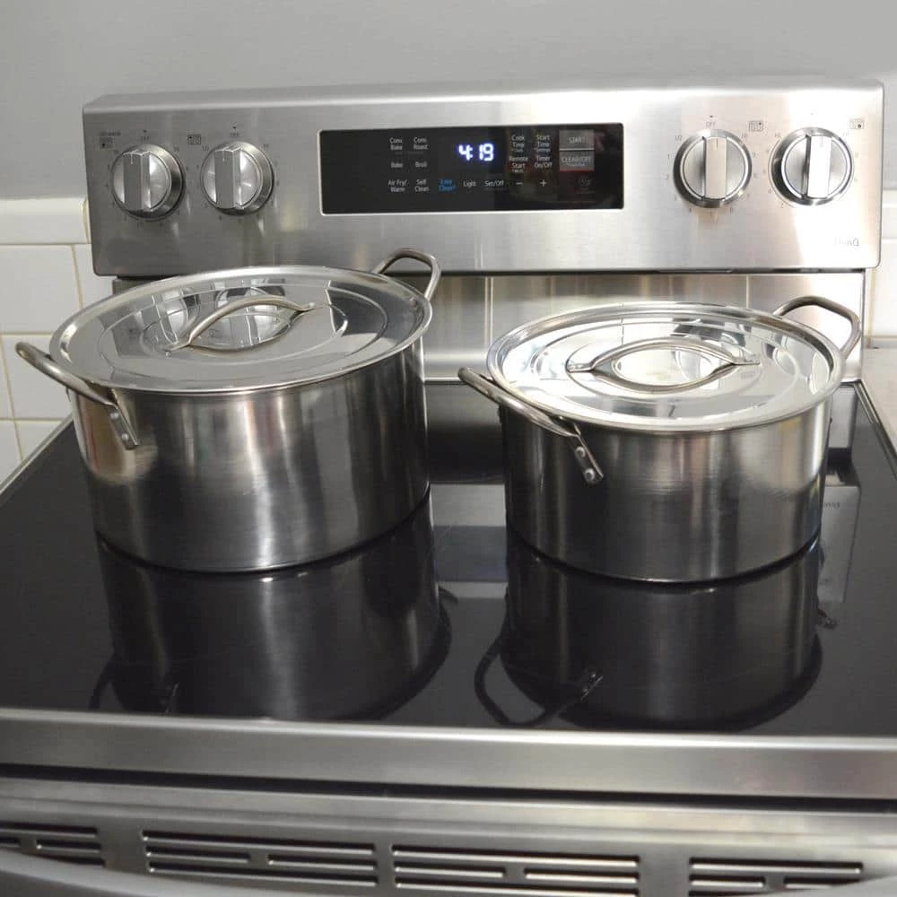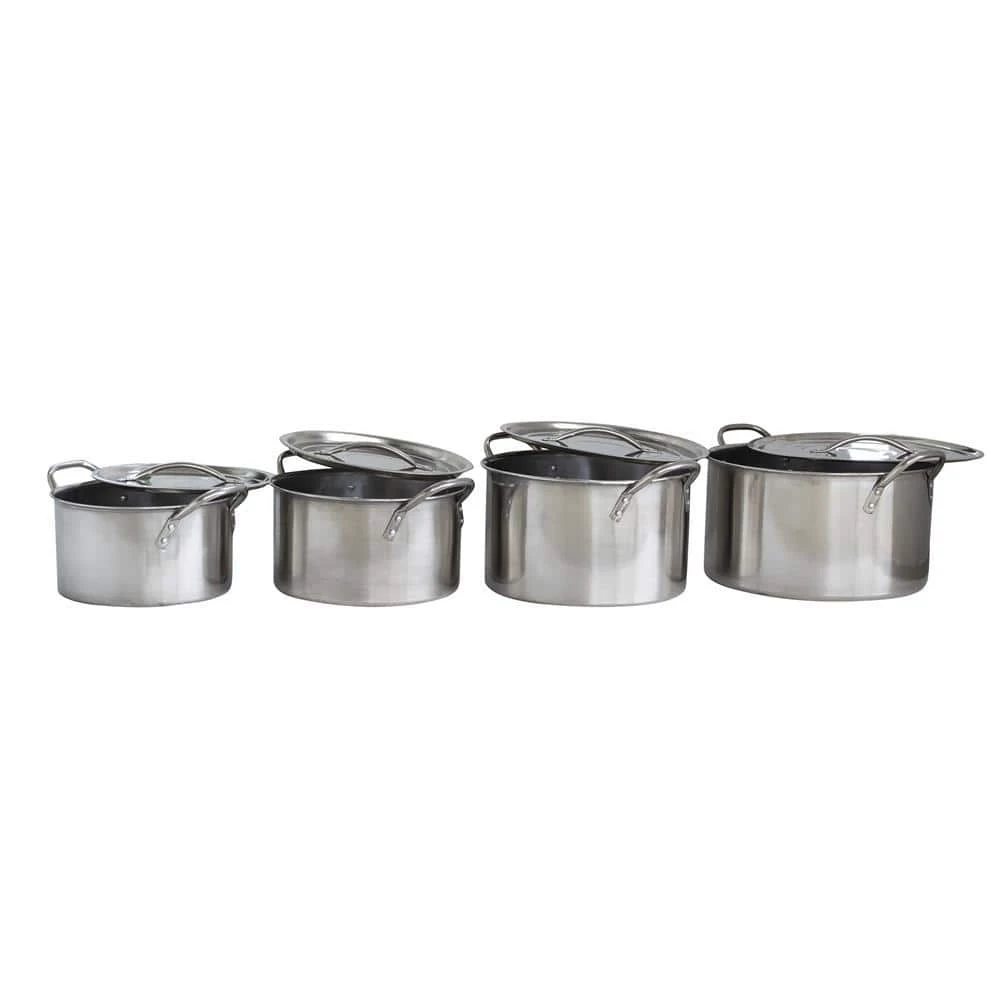 Simmer and boil delicious soups, stews, and broth with the AmeriHome 8 Piece Stainless Steel Stock Pot Set. Four pots with matching fitted lids are constructed of 202 grade stainless steel, which conducts heat well, plus it is tough and long lasting. Ideal for the campsite, or as an extra set of pans in the trailer or RV. The stainless steel construction also makes this set dishwasher safe, so clean-up is simple. Two riveted handles on each pot can safely take the weight of a full Stock Pot. Hollow handles on the lid stay cooler to the touch.