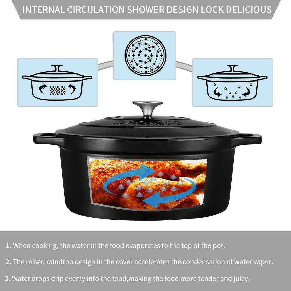 The enameled cast iron dutch oven with a self-basting Lid, ideal for delicious dinners for any occasion. The oversized handles and stainless-steel knob provide a sturdy grip for easy handling and carrying. Interior enamel has a smooth finish that promotes caramelization, prevents sticking, and resists stains. Ideal for roasting meat, slow cooking stews, baking bread and all kitchen tasks. You’ll enjoy a lifetime of healthy cooking with your vancasso cookware.