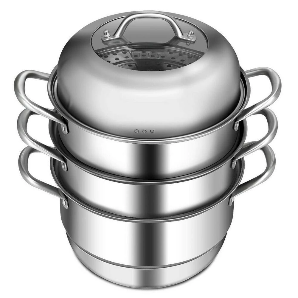 The 3-layer stainless steel cookware steamer is made of food-grade stainless steel, which not only ensures food safety, but also facilitates cleaning. The combination of 2 steamers and 1 pot is not only suitable for steaming food, but also for cooking soup and porridge. The 3-layer composite bottom can effectively achieve uniform heating and also extend its service life.