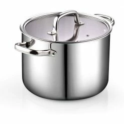 Tri-ply Clad metal construction is a combination of 18/10 stainless steel with an aluminium core creating a permanent bond of metal allowing heat to pass through the whole pan-along the bottom and up The sidewall-giving you a maximum cooking performance The Cook N Home Tri-Ply Clad Stainless Steel Stockpot with Lid 8 qt. comes with a tempered glass lid with steam vent to view food and keep heat/moisture in It has riveted handles for strength Induction compatible can be used on all type of stovetop gas electric ceramic glass Oven-safe up to 500° Fahrenheit glass lid 350° Fahrenheit Dishwasher safe hand washing is recommended.