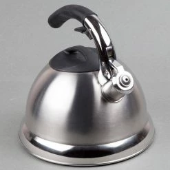 Whistling tea kettle made of heavy gauge stainless steel which features an aluminum capsulated bottom. A lever system which lets you open and pour the kettle without the risk of burning your fingers. This has an insulated handle with easy pour and fill.