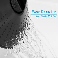Enjoy the durable stock pot set that contain a non stick coating in the interior of carbon steel material body. The noodle pots contain a lockable straining lid for secure straining after the noodles are cooked and avoids the use of a strainer or colander. The 2-pot set includes a 4 qt. and 2 qt. stockpot which measure 7 in. Dia and 5 in. H and 10 in. Dia and 4.5 in. H.