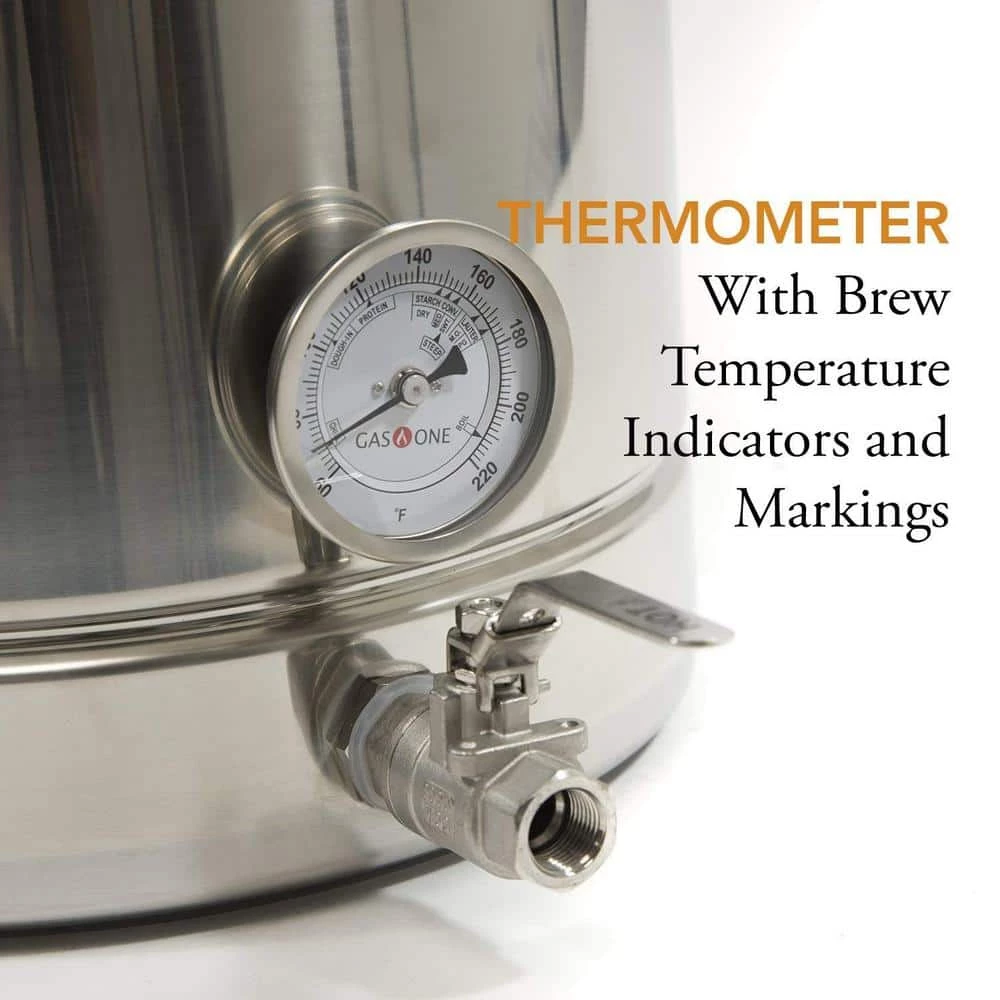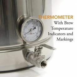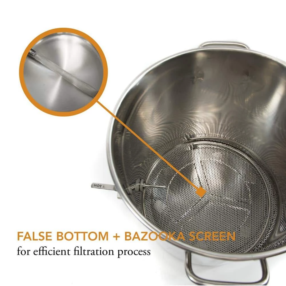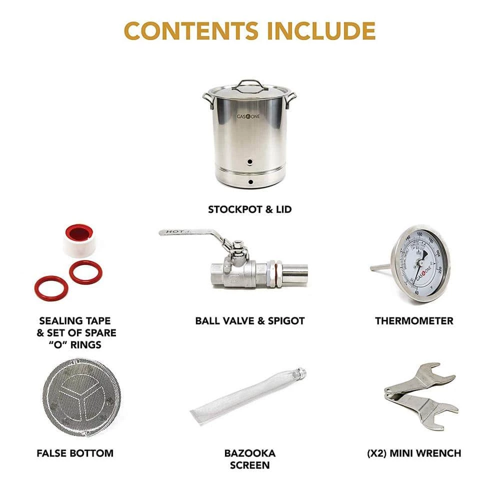 - Includes – 1 x stock pot 1 x lid x 1 brew thermometer x 1 false bottom x 1 bazooka screen x 1 set of mini wrench x 1 O-rings x 1 sealing tape x 1 spigot x 1 ball valve 1/2 FNPT