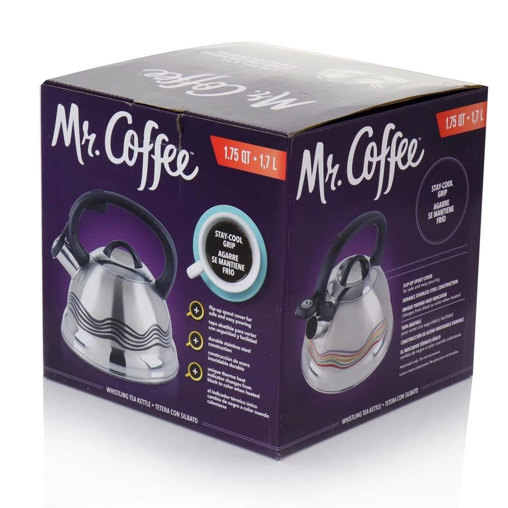 Jump start your morning with the Mr. Coffee Cagliari 1.75 Qt. Stainless Steel Whistling Tea Kettle with Stay Cool Handle. Features unique black stripes that change colors when the kettle is heated. The flip open spout includes a built in whistle to indicate boiling water. Its bakelite handle stays cool under heat for safe and easy handling. Serve guest with herbal tea, artisanal pour over coffee, or a comforting cup of hot chocolate.