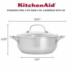 Experiment with and discover new flavors and techniques when cooking with the KitchenAid 3-Ply Base Stainless Steel Casserole, designed with an extra thick layer of heat-conducting aluminum to eliminate hot spots by distributing heat evenly from edge to edge. Heavy-gauge stainless steel pot features a heavy bottom base for lasting durability and has dual-riveted handles for a firm, confident grip when moving around the kitchen. Tempered glass lid helps to lock in heat for rich and textured flavor. Curious cooks can investigate a wider range of recipes in the broiler and oven, where cookware is safe to 500°F, 350°F with lid.