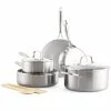 The Cooks Standard 9-Piece Stainless Steel Cookware Set includes: 1.5 Qt. saucepan with lid, 3 Qt. saucepan with lid, 6 Qt. stockpot with lid, universal steamer insert with lid, and 10 in. fry pan. The items are made of 18-10 stainless steel with aluminum disc layer in the bottom for even heat distribution. Handles stay cool and are comfortable to hold while cooking. Cookware is dishwasher safe and compatible with induction, gas, electric, ceramic, etc. Pots and pans are oven safe to 500F, with glass lid oven safe up to 350F.