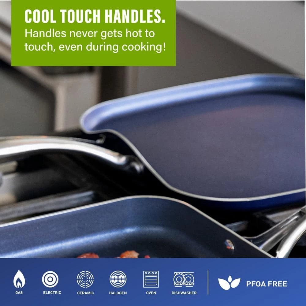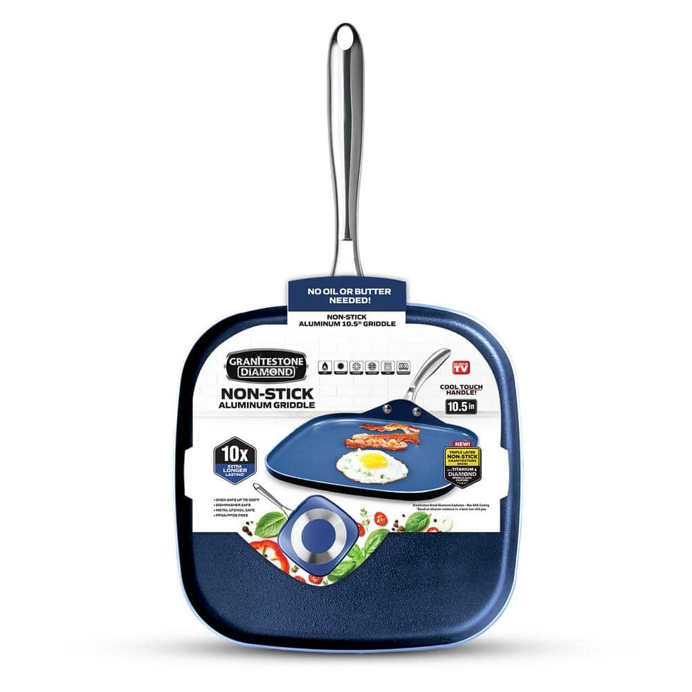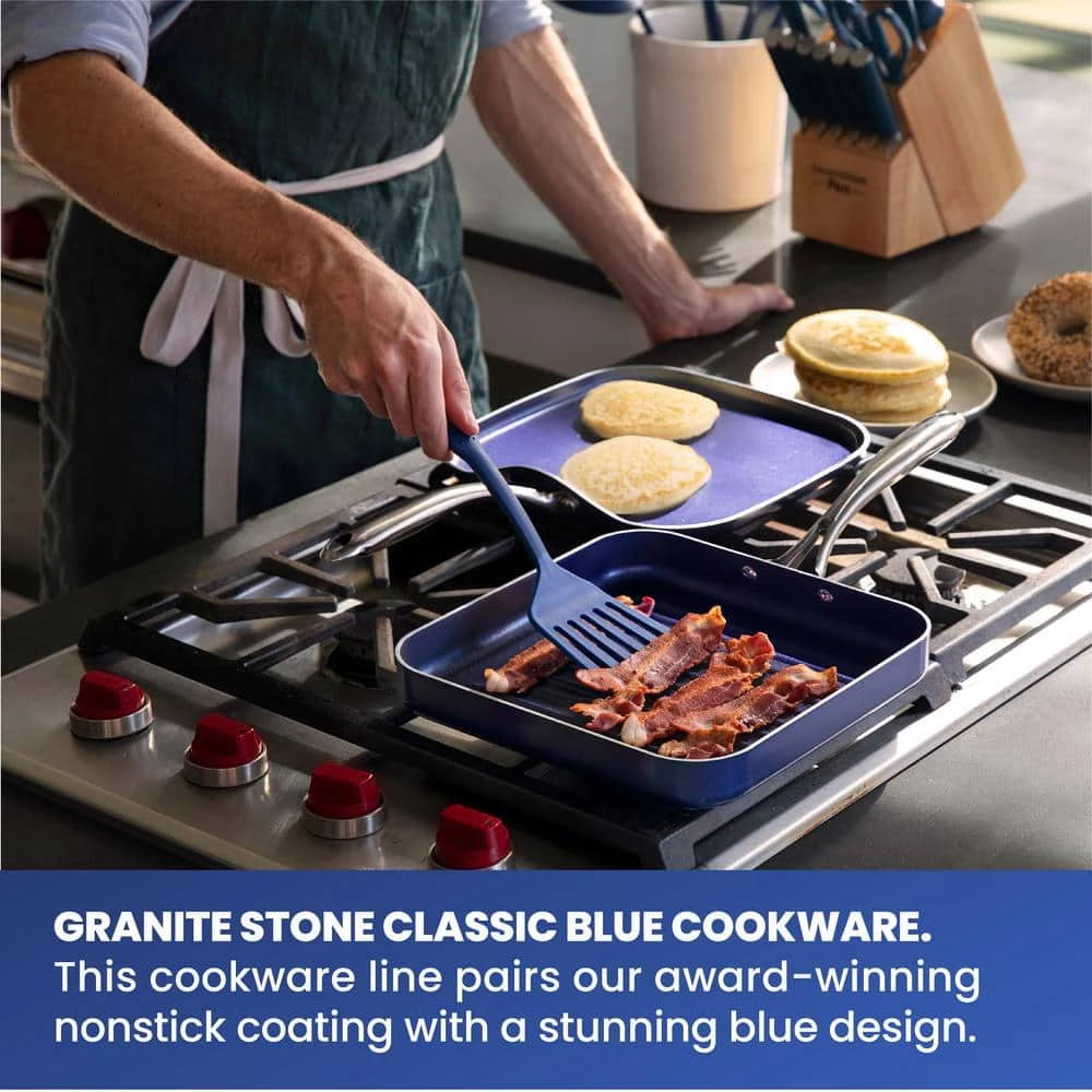 Introducing our new Granite Stone Blue Collection. An elegant cookware set that will upgrade any kitchen with it’s rich royal blue color. Pioneering Granite Stone cookware features a mineral-infused granite coating that is the perfect blend of nonstick durability and ease of use. The Granite Stone cookware is pressed from a single sheet of aluminum and layered 3X with our proprietary coating for the ultimate nonstick experience. Our pans require no butter or oil making healthy cooking easy. The extra thick coating is super durable and is scratch resistant and metal utensil safe.