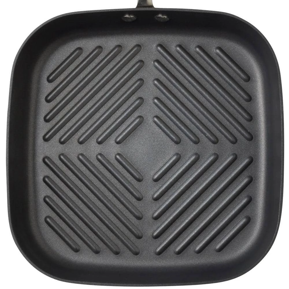 Enjoy grilling rain or shine with the Rachael Ray 11-Inch Hard Anodized Nonstick Deep Square Grill Pan. The sturdy and durable hard anodized indoor grill pan is the ideal solution to indoor grilling as it promotes even heat distribution to thoroughly and evenly cook any meal on your stovetop, while raised ridges provide an authentic steakhouse sear when grilling indoors. The nonstick grill pan has a dual-riveted handle for comfort and control while cooking and moving around in the kitchen, and is oven safe to 350°F to make finishing dinner off in the oven a simple task. Whether grilling steaks or grilling burgers or grilling chops, the enhanced nonstick makes food release a breeze, and the nonstick grill pan is dishwasher safe for quick and easy cleanup. Enjoy steaks, chops, burgers and more when cooking with Rachael Ray’s Hard Anodized 11-Inch Nonstick Deep Square Grill Pan.