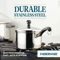 This Farberware Classic Series 2-Quart Stainless Steel Saucepan with Lid is sure to come in handy at all times of the day or night. Farberware has been trusted for over 100 years, and this saucepan continues that tradition for a new generation. A full cap base featuring a thick aluminum core surrounded by stainless steel provides rapid, even heating, perfect when cooking oatmeal or poaching an egg or two at breakfast. The heavy-duty stainless steel is polished to a mirror finish for a classic touch, and the comfortable saucepan handle with iconic styling provides a confident grasp. This 2-quart saucepan works beautifully when reheating a serving of macaroni and cheese at lunch, cooking a side of rice during dinner, or warming chocolate sauce to top off an ice cream sundae for dessert. A self-basting lid helps seal in heat and flavor and the saucepan is dishwasher safe and oven safe to 350°F, making it a perfect complement to the rest of the Farberware collections. Rely on the versatile, dependable Farberware Classic Series 2-Quart Stainless Steel Saucepan with Lid for everything from reheating leftovers to helping make dessert.”