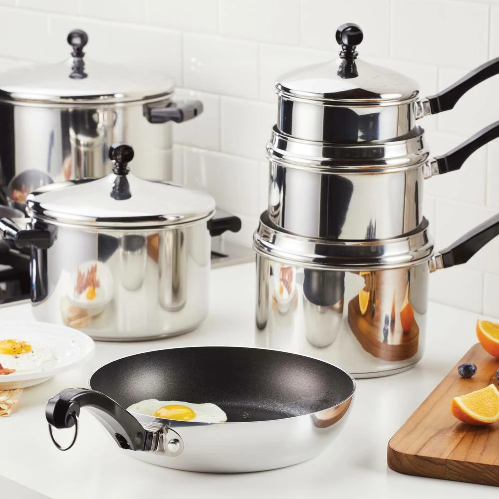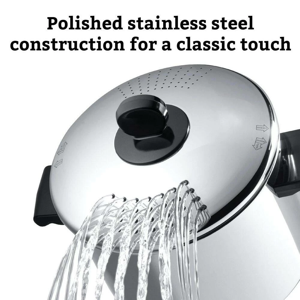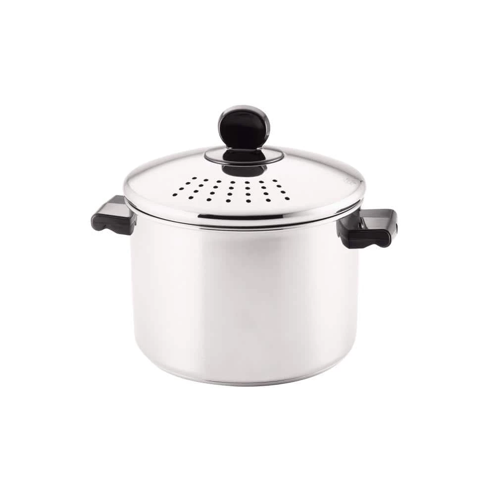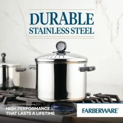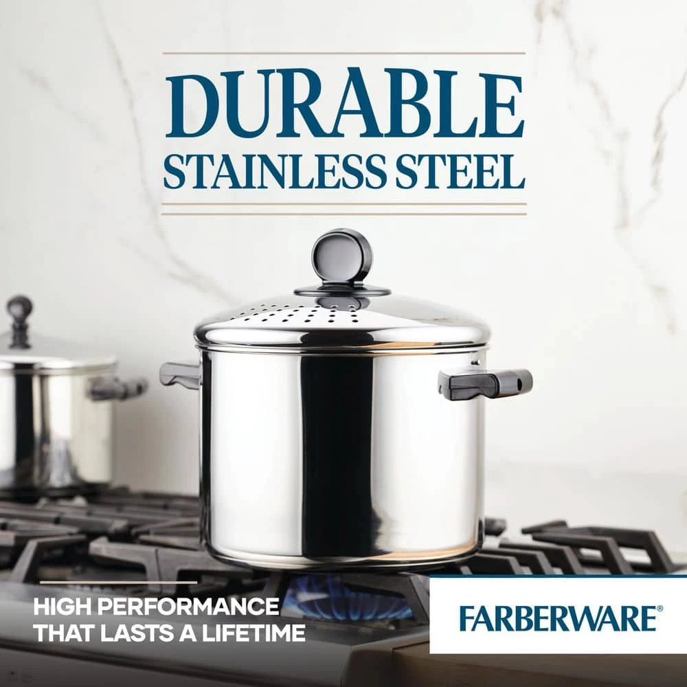 With this Farberware Classic Series Stainless Steel 8-Quart Covered Straining Stockpot, there’s no need to grab a separate strainer or colander when preparing a weeknight meal. A full cap base featuring a thick aluminum core surrounded by stainless steel provides rapid, even heating, ideal for boiling linguine or simmering beef stew. Heavy-duty stainless steel is polished to a mirror finish for a classic touch. The built-in colander lid helps strain liquid from foods directly from the pan by simply twisting the lid to lock it in place. To accommodate a variety of foods, the lid has large and small straining holes. The comfortable handles with iconic styling provide a confident grasp. Dishwasher safe and oven safe to 350°F, this straining stockpot makes a great addition to any Farberware collections cookware set. Enjoy a stockpot and colander rolled into one with this versatile Farberware Classic Series Stainless Steel 8-Quart Straining Stockpot with Lid.