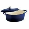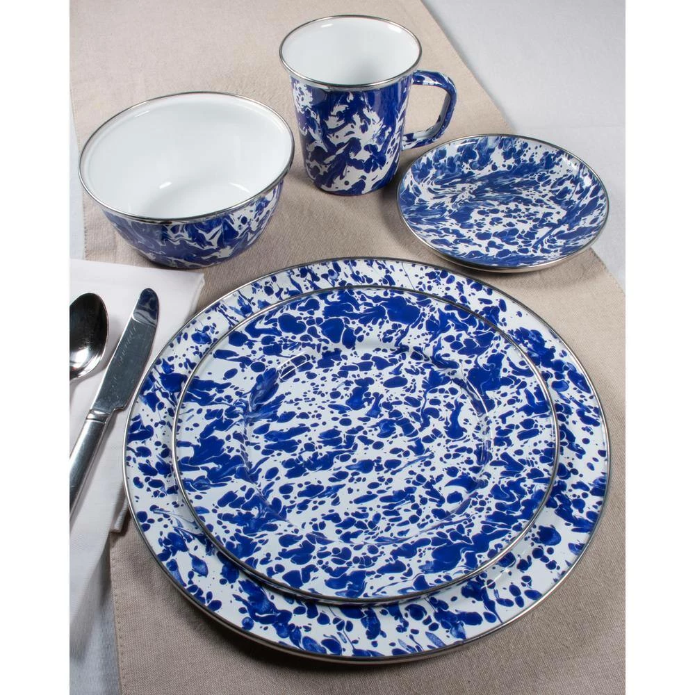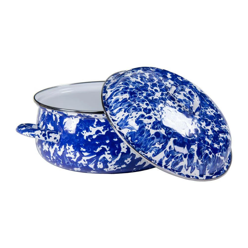 4 qt. Dutch Oven, 3.5 in. deep x 9 in. wide interior, 6.5 in. tall with lid This enamelware is made of carbon steel coated with a porcelain enamel and trimmed in stainless steel. There will be variations in the shading of colors and pattern formations which are the results of the hand-dipped process. The swirl design is a classic, retro staple for enamelware cookware and serveware. The contrast of colors creates a distinct look and brings a casual artistic flair to your table setting. Each piece is individually hand crafted and is as unique as you are. Skilled artisans hand dip the white background color, then use a brush to hand apply the secondary color swirls. This creates a unique piece and design each time. The elegant and inviting aesthetic draws the eyes into the many spattered patterns flowing throughout. Your piece will be one-of-a-kind and exclusive to you as you create your own distinctive style.