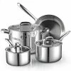 - Convenience and control: pots and pans feature double-riveted, rubberized stainless steel handles and shatter-resistant glass lids