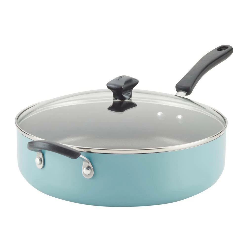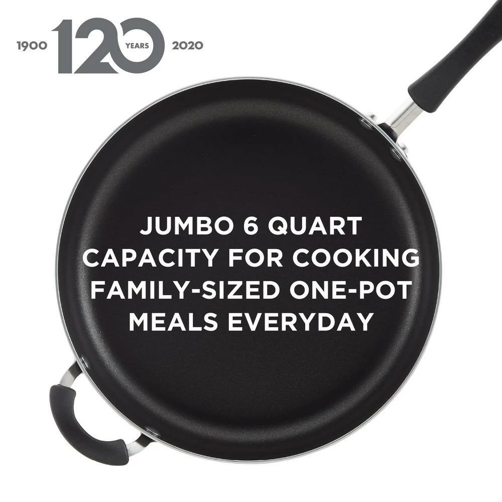“Equip the kitchen for convenience and reliability to make family-sized one-pot meals with the Farberware Cookstart 6-Quart Nonstick Jumbo Cooker. Crafted from heavy-duty aluminum for excellent heat distribution, this big 6 qt jumbo cooker is ideal for making a zesty seafood paella or a delicious cheddar mac-n-cheese and boasts a superior DiamondMax(tm) nonstick interior that performs 3X better than ceramic nonstick for easy food release and cleanup with a distinctive look. Oven safe to 350°F with comfortable handles for a confident grip, this jumbo chef’s pan has a shatter-resistant glass lid to seal in heat and moisture and a colorful exterior that looks great in any kitchen. Plus, it’s dishwasher safe for quick, convenient cleanup. Be ready to create big and delicious one-pan meals every day with the convenient, easy cleaning Farberware Cookstart 6-Quart Nonstick Jumbo Cooker with DiamondMax(tm) Nonstick.”