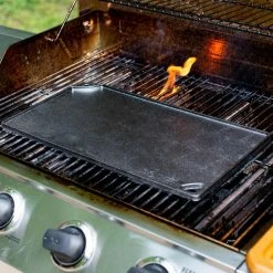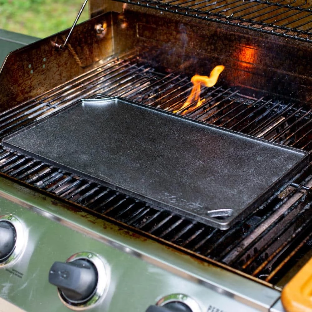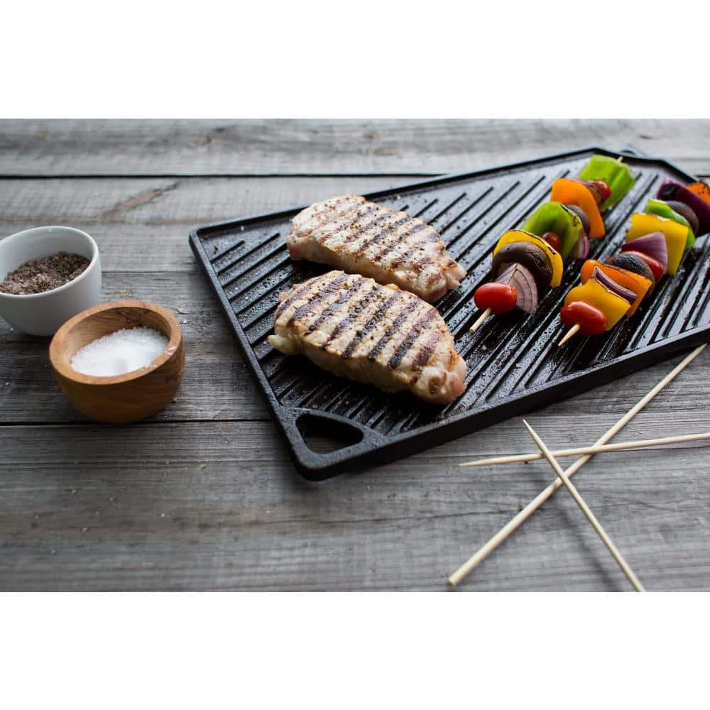 The Lodge 2 burner reversible griddle features a smooth side for making grilled cheese sandwiches as well as eggs and pancakes. The ribbed side is perfect for grilling foods such as steak, fish, chicken and hamburgers. Cast Iron seasoned reversible Grill/Griddle. Use the smooth side for eggs and pancakes and the grill side for foods such as steaks, fish, chicken and hamburgers. Fits over 2 stovetop burners. Grill. Griddle. Repeat for ever and ever. This hardworking piece of cast iron is with iron and oil and doubles as a grill and griddle. The naturally seasoned cooking surface is ready to help you do double duty and delivers meals to the table with sizzle and style. Seasoned and ready to use.
