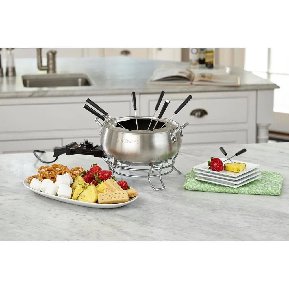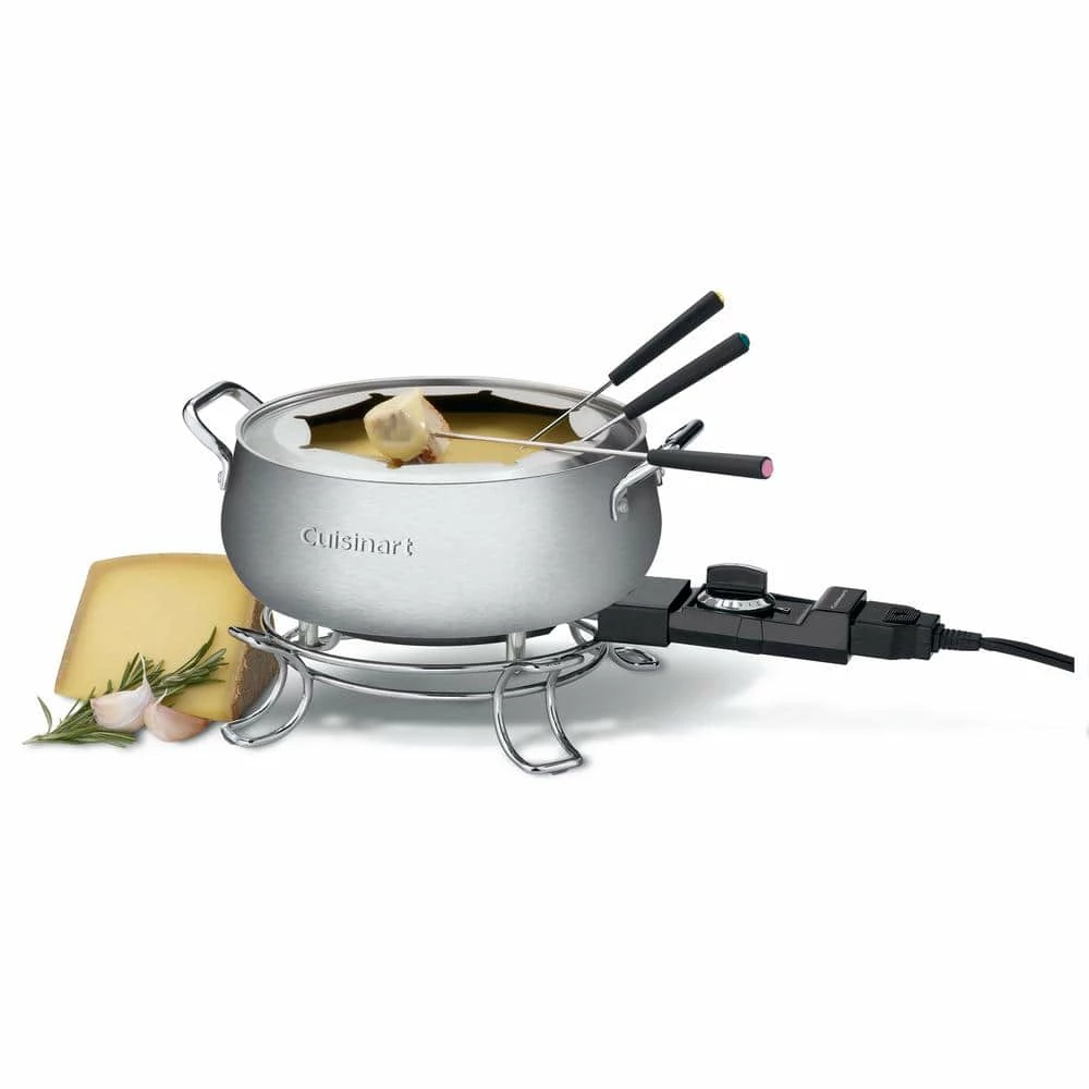 Cuisinart Electric Fondue Set Now fondue is easier than ever. The stick-free Cuisinart Electric Fondue Set has a heating element built into the base of the pot and a thermostat that adjusts to a wide range of temperature settings. Consumers can prepare chocolate, cheese, broth or oil fundues in this elegant 3 Qt. brushed stainless pot. As always, Cuisinart makes cleanup easy. The nonstick pot offers superb food release, and the entire unit is dishwasher safe.