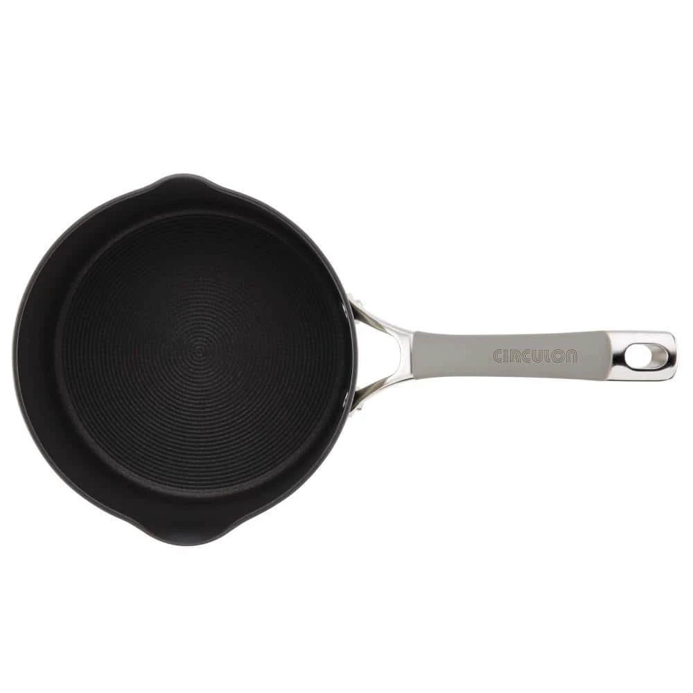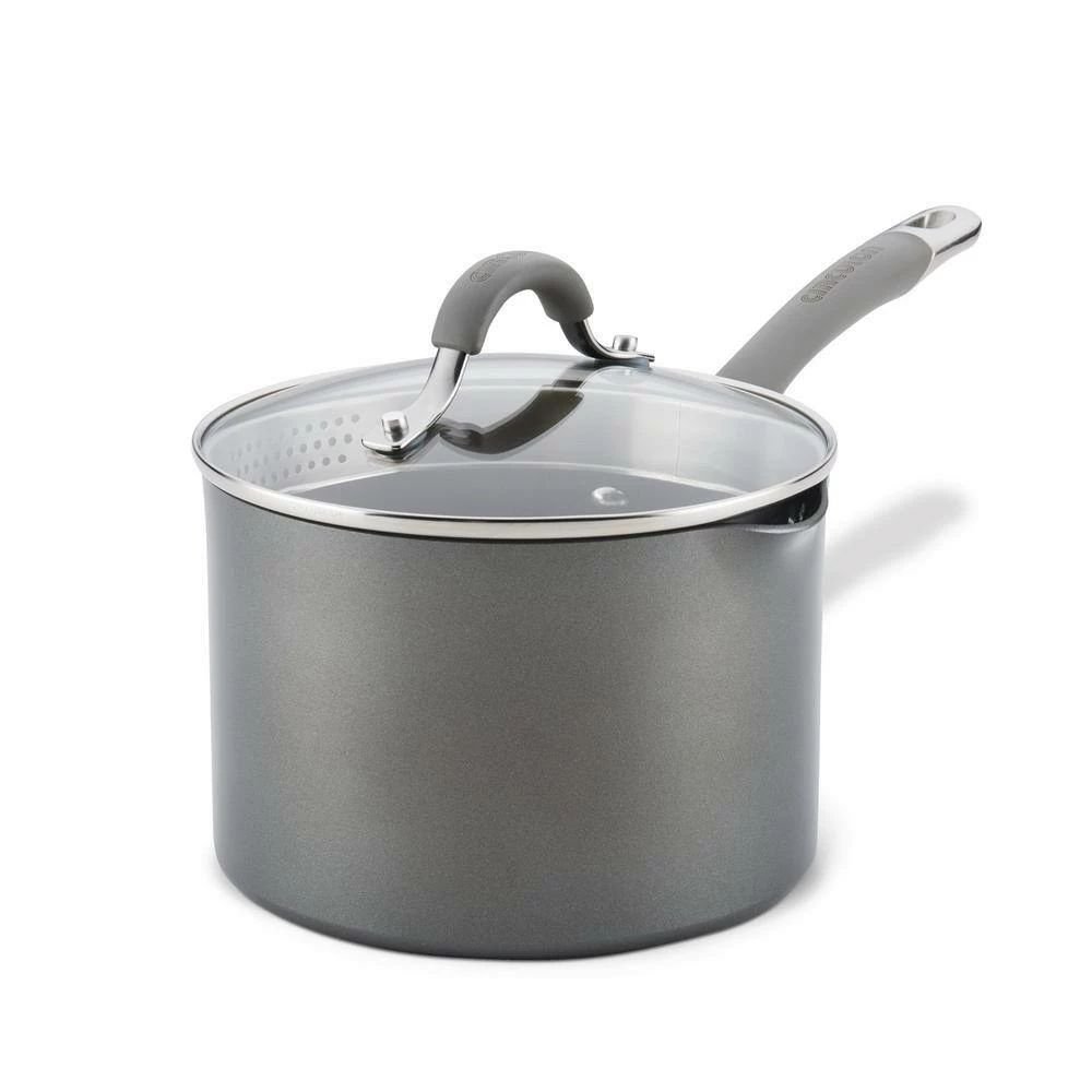 Get a solution-driven, versatile saucepan to help you work smarter in the kitchen with the Circulon Elementum Hard-Anodized Nonstick 3 Qt. Covered Straining Saucepan. Crafted from super-tough, hard-anodized aluminum that’s twice as strong as stainless steel, this straining saucepan boasts the TOTAL Nonstick System of raised circles and triple layer, premium quality nonstick for long-lasting food release and easy cleanup. A shatter resistant, tempered glass lid seals in heat and moisture and features a built-in colander to make perfect al dente pasta or pull together a healthy spring medley of steamed vegetables without the need for extra cookware. Plus, convenient pour spouts make draining and transferring soups, stews and cooking liquids a cinch. Dual riveted stainless steel handles with sleek silicone grips provide a solid, comfortable grasp and are heat safe up to 400°F. PFOA-free, metal utensil safe nonstick inside and out come in show-stopping oyster gray exterior color while delivering superior food release and super-easy cleanup of even the stickiest recipes. Circulon nonstick technology is so advanced, it lasts 10 times longer than ordinary nonstick. That’s why Circulon comes with a Hassle-Free Lifetime Guarantee.