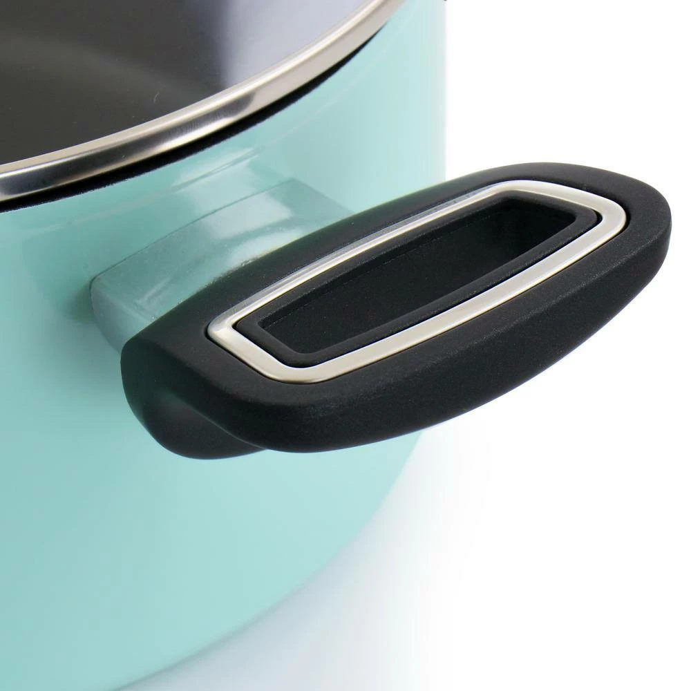 This 5 qt. Dutch oven by Martha Stewart is the perfect combination of style, quality, and convenience. The durable forged aluminum body is perfect for braising, stewing, and boiling. Featuring soft touch handles that stay cool for easy transport, and a nonstick interior for low oil cooking and easy cleanup. Comes with a tempered glass lid that allows safe monitoring of your cooking progress. And to top it off, this Dutch oven is compatible with all stove tops including induction.