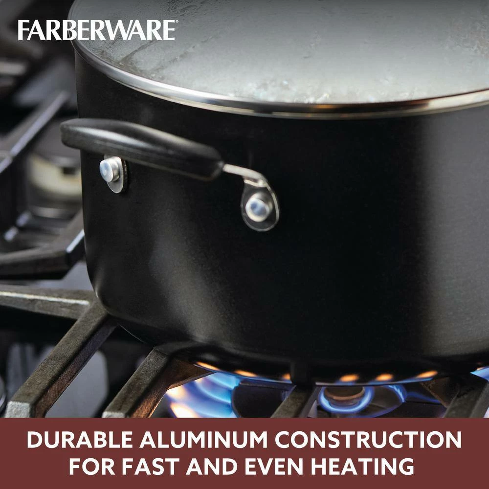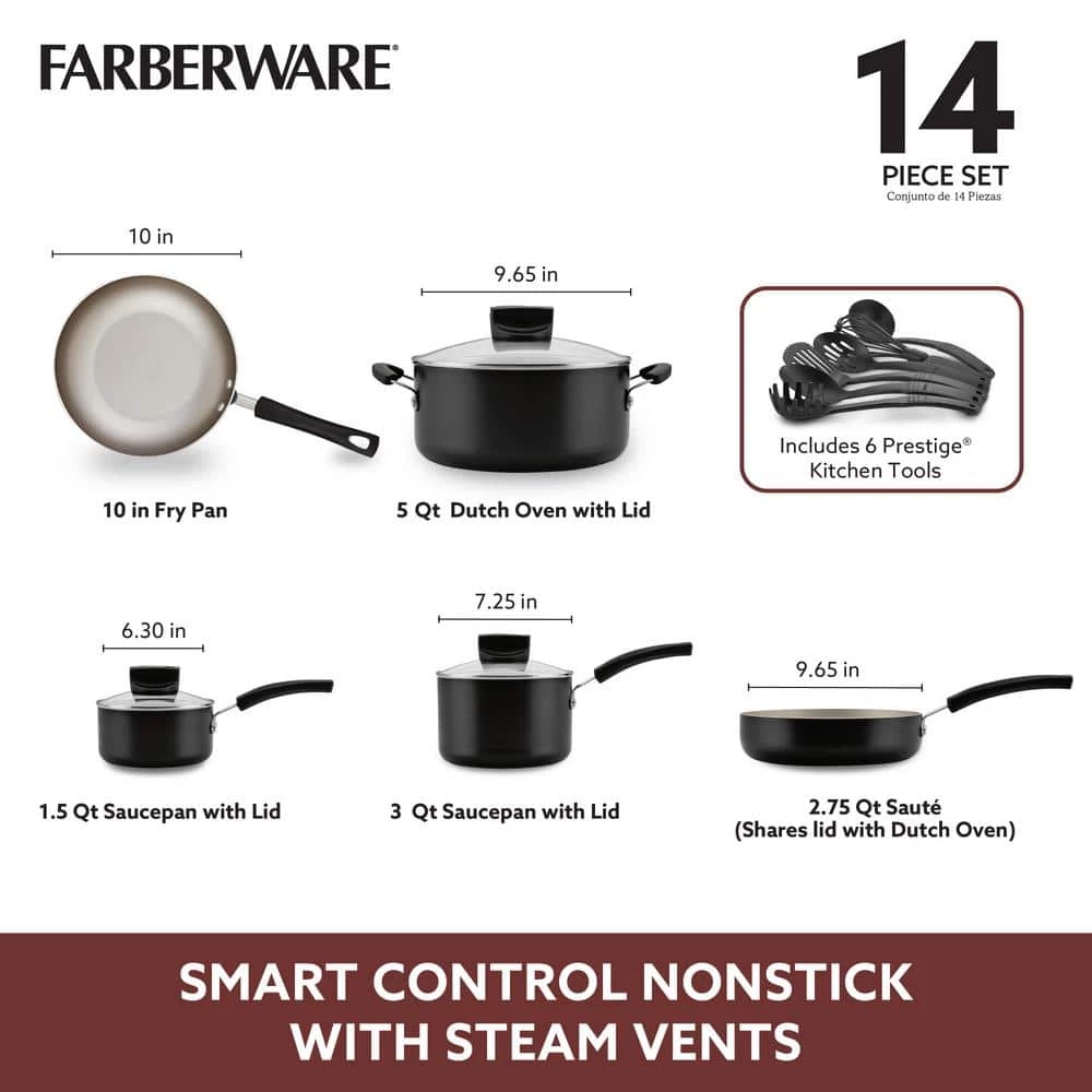 Cook safer with fewer boil-overs using Farberware Smart Control(tm) Nonstick Cookware. This 14-piece set of essential pots and pans includes two saucepans and a 5 qt. Dutch oven that conveniently shares a lid with a 2.75 qt. saute pan. Made from fast and even-heating aluminum, the pots and pans feature a trimmed base for better heat conduction and DiamondMax(tm) nonstick technology that performs 3X better than traditional nonstick. Stay in control with glass lids that have an innovative Smart Control(tm) steam vent incorporated into the knob to help prevent boil-overs on the cooktop. The PFOA-free nonstick releases food effortlessly and all of the pots and pans are dishwasher safe for fast, easy cleanup. Plus, this 14-piece cookware set includes six Prestige kitchen utensils so you can start making family favorites right away. Get smart control of your pots and pans with the convenience, durability, and steam vent technology of Farberware Smart Control Nonstick Cookware.