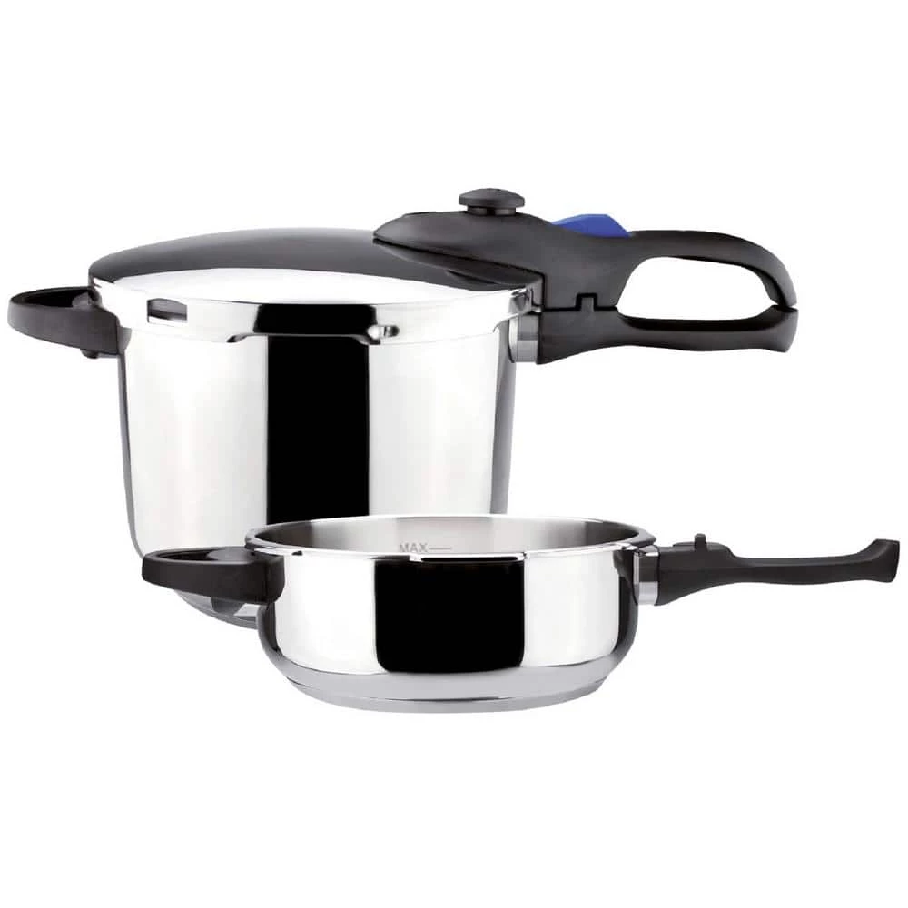 Favorite Six (6.3 Qts. + 4.2 Qts.) Super-Fast Pressure Cooker (11.6 PSI) allows reducing cooking time up to 70% compared to conventional cooking methods. Both bodies can be used with the same lid, allowing you cook different amount of food depending on who is coming for dinner. Long lasting durability thanks to its stainless-steel design and suitable for any type of stove: gas, electric, induction and ceramic. Essential for a healthy lifestyle as it preserves vitamins and minerals usually lost in traditional cooking methods. This high-performance pressure cooker can be used for pressure cooking, pressure canning, roasting and steaming. Resistant to rust, warping, cracking, tarnishing and stains. It unlock position to remove for cleaning and dishwasher safe make the Favorite Super-Fast Pressure Cooker the winner for effortless clean up.