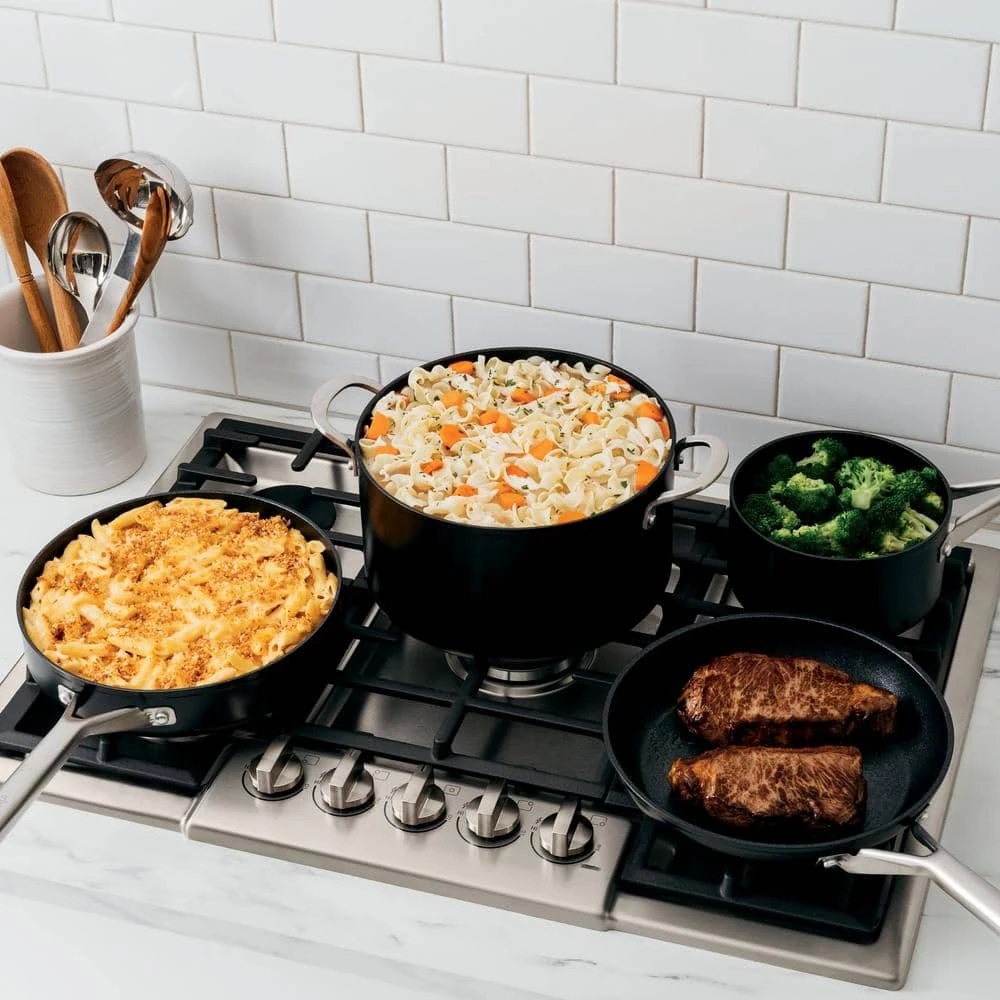 - Dishwasher safe. PFOA, cadmium, and lead-free. All range capable.