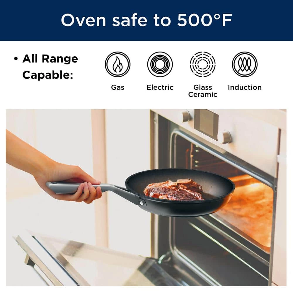 - Lids, handles, and nonstick coating are oven safe to 500°F