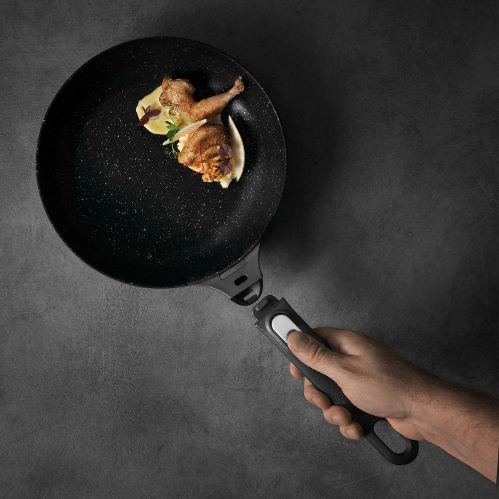 Highly functional with an innovative design, these frying pans are keepers. The variety of sizes allow you to make omelets or pancakes, pan-fry fish or sear meat before using it in a stew or casserole. The aluminum body ensures a fast and even heat distribution to avoid burned edges while the multi-layered non-stick coating makes no or low fat frying possible for health-conscious cooking. With a simple twist you can detach the handle to use these pans in the oven as well. Set includes: 8 in. Non-Stick Fry Pan, 10 in. Non-Stick Fry Pan, 11 in. Non-Stick Fry Pan.