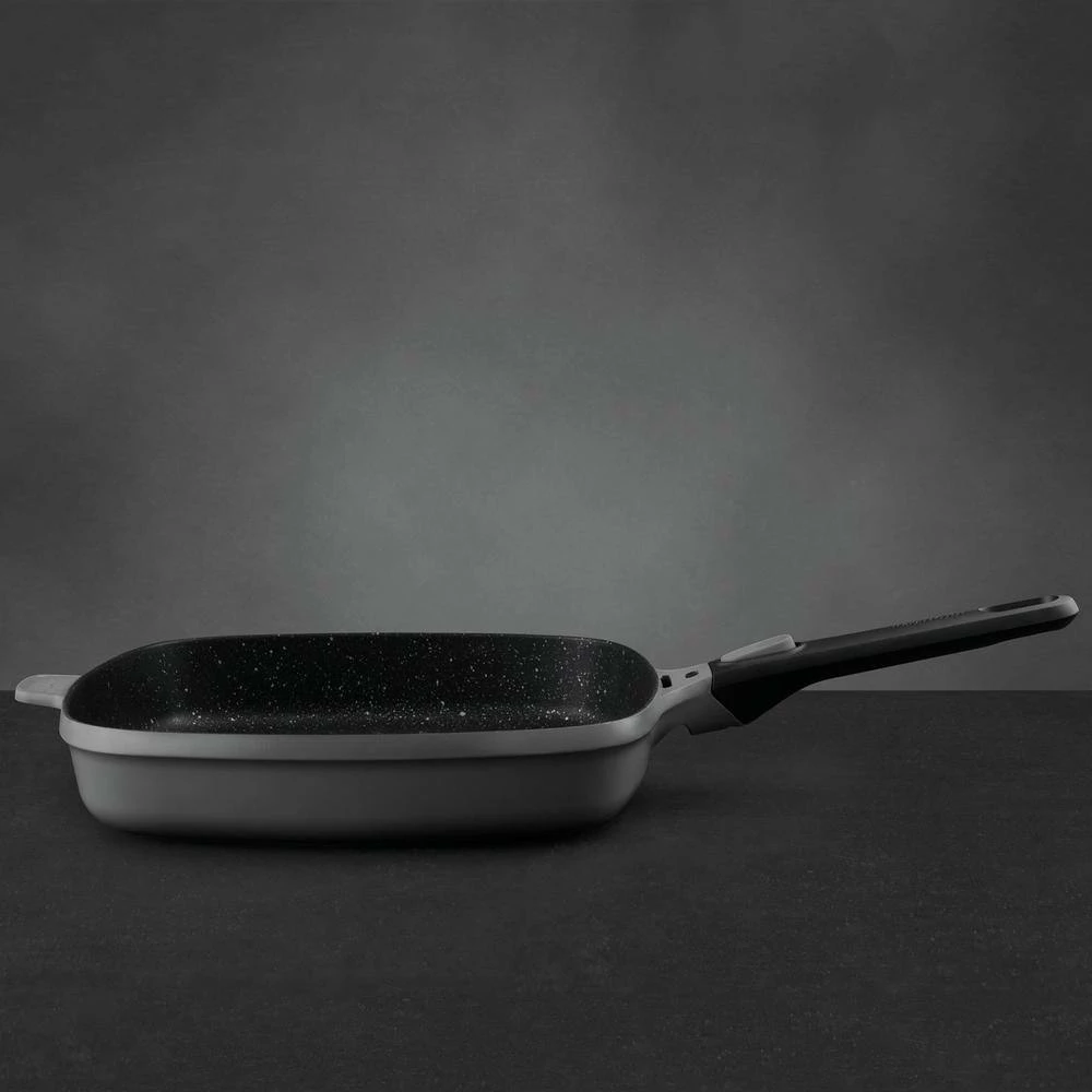 A batch of perfectly seared burgers, salmon fillets or vegetables, it’s a piece of cake when you’ve got this 28 cm grill pan at your side. The aluminum body ensures a fast and even heat distribution on any kind of stovetop while the ridged base gives your ingredients those typical sear marks and allows moisture and fat to escape for an extra crispy result. No need to worry about the clean-up thanks to the multilayered non-stick coating that guarantees an easy food release. An added bonus is the detachable handle that allows you to use the pan in the oven and save valuable storage space. Suitable for all cooktops including induction. Inside dimensions: 11 in. x 11 in. x 2 in. outside dimensions: 20.5 in. x 11.25 in. x 4 in.