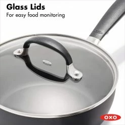 Cook like a pro with the OXO Good Grips Non-Stick Saucepan Set. Both pans feature a 3-layer, German-engineered non-stick coating that provides effortless performance while using less oil and delivers quick and easy cleanup. The scratch-resistant, hard-anodized bodies heat faster and more evenly than traditional aluminum and the silicone-wrapped stainless steel handle helps keep cooking comfortable. Angled side walls help liquids evaporate quickly and the rounded bottoms help with efficient stirring. The durable glass lids make it easy to check on your progress, whether you’re simmering stew or braising meat. Hand wash. Oven safe up to 390°F/200°C.