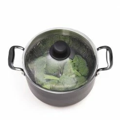 - Removable handle extends and locks into position for filling and transporting and retracts to accommodate pot lids while steaming