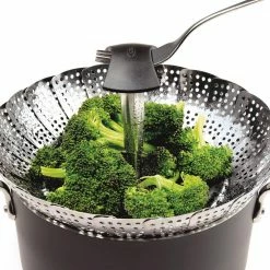With a simple pull of the Stainless Steel Steamer’s telescoping handle, it extends to provide added length, making it easy and safe to use in hot pots. Press the handle again to lock it down and fold feet in for compact storage. For even more reach, a fork can be inserted into the handle. Steamer works well in most pressure and multi-cookers. No kitchen is complete without this vegetable steamer.