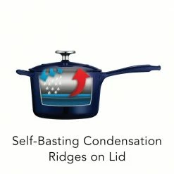- Self-basting condensation ridges on lid uniformly collect and direct vapors onto food, producing moist and savory dishes