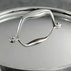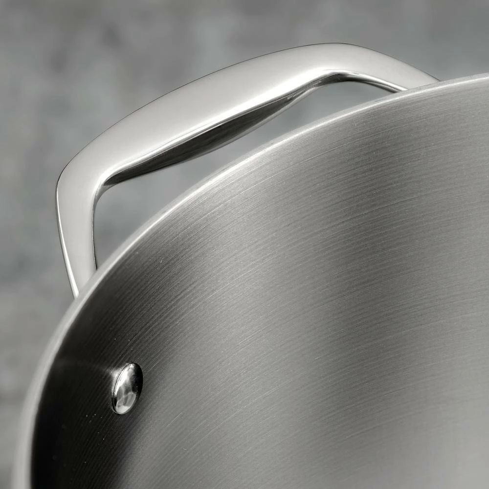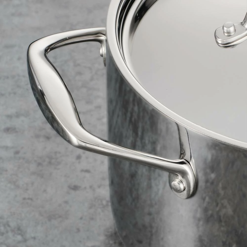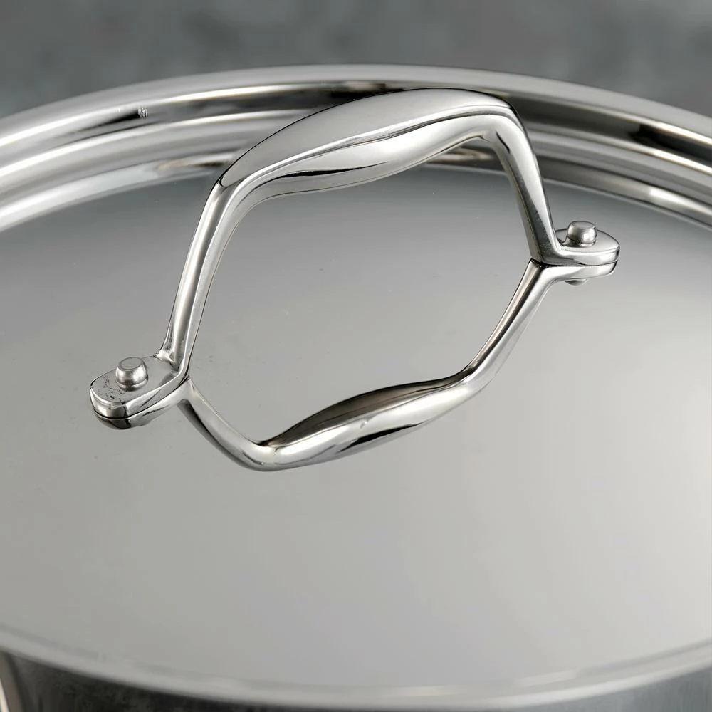 - Precision cast riveted handles and mirror-polished stainless-steel lid