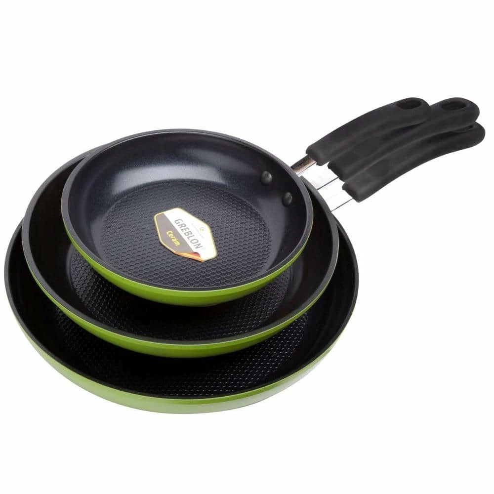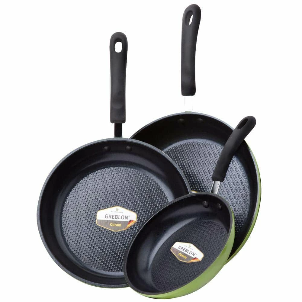 Utilizing GREBLON an ultra-safe ceramic coating from Germany, the Green Earth Pan Set by Ozeri achieves non-stick perfection while remaining absolutely free of PTFE, PFOA, APEO, NMP and NEP. The set includes an 8, 10 and 12 in. pan, each featuring a honeycomb textured cooking surface that prevents food bonding and distributes heat to enhance cooking performance. Conventional pans achieve their non-stick performance through a synthetic coating of PTFE (PolyTetraFluoroEthylene). At high charring temperatures, PTFE can release fumes which are documented to be lethal to small pets, and can be harmful to humans. Traditional pans are also often made with the aid of PFOA (PerFluoroOctanoic Acid), a potential carcinogen, and APEOs (Alkylphenol ethoxylates), which are under restricted use in Germany due to environmental concerns. With the Green Earth Pans, no such harmful toxic substances are released. Each Green Earth Pan utilizes an inert ceramic coating that is applied using a water based Sol Gel Technique which is free of the lesser known but potentially harmful chemicals NMP (N-Methyl-2-pyrrolidone) and NEP (N-ethyl-2-pyrrolidone). The Green Earth Pans possess superior non-stick properties that allow you to saute with half the oil normally used, and cleaning is a breeze. Each pan is made of die-cast aluminum with a magnetized bottom for induction stoves, and a heat-resistant silicone-coated handle. GREBLON made by Weilburger GmbH, Germany. Final assembly in China.