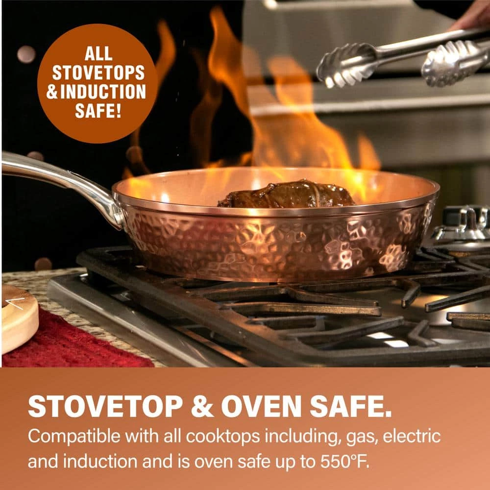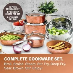 Designed in Italy, this Gotham Steel cookware set marries the traditional beauty of hammered copper with the latest in non-stick advances. Aluminum construction, triple-coated with our proprietary Ti-Cerama surface produces even heat for simmering risotto and sauces, pan-frying or slow-braising meats and stews. It is PTFE and PFOA free which means nothing will stick. Cooking without butter or oil. Gotham Steel will change the way you cook and clean. The Ti-Ceramic coating allows for easy clean up and dishwasher safe.