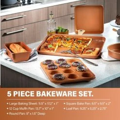 - Set includes: 8” fry pan, 10” fry pan with lid, 1.5 qt sauce pan with lid, 2.5 qt sauce pan with lid, 5 qt stock pot with lid, 9.5” deep square pan (4pc set), 9.5” shallow square pan, stainless steel steamer, cookie sheet, muffin pan (holds 12 muffins), round baking pan, square baking pan, and loaf pan