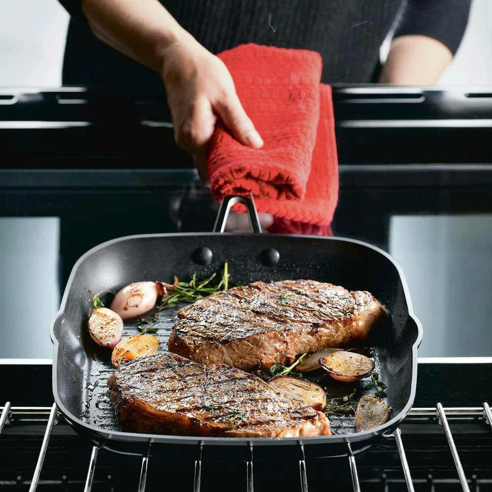 - Raise it up: indoor grill pan features raised ridges to help achieve the perfect steak house sear when grilling steaks, chicken, fish, or lamb on the cooktop
