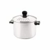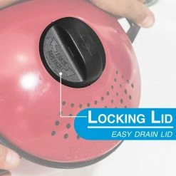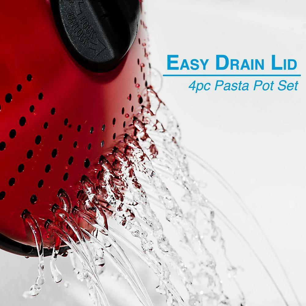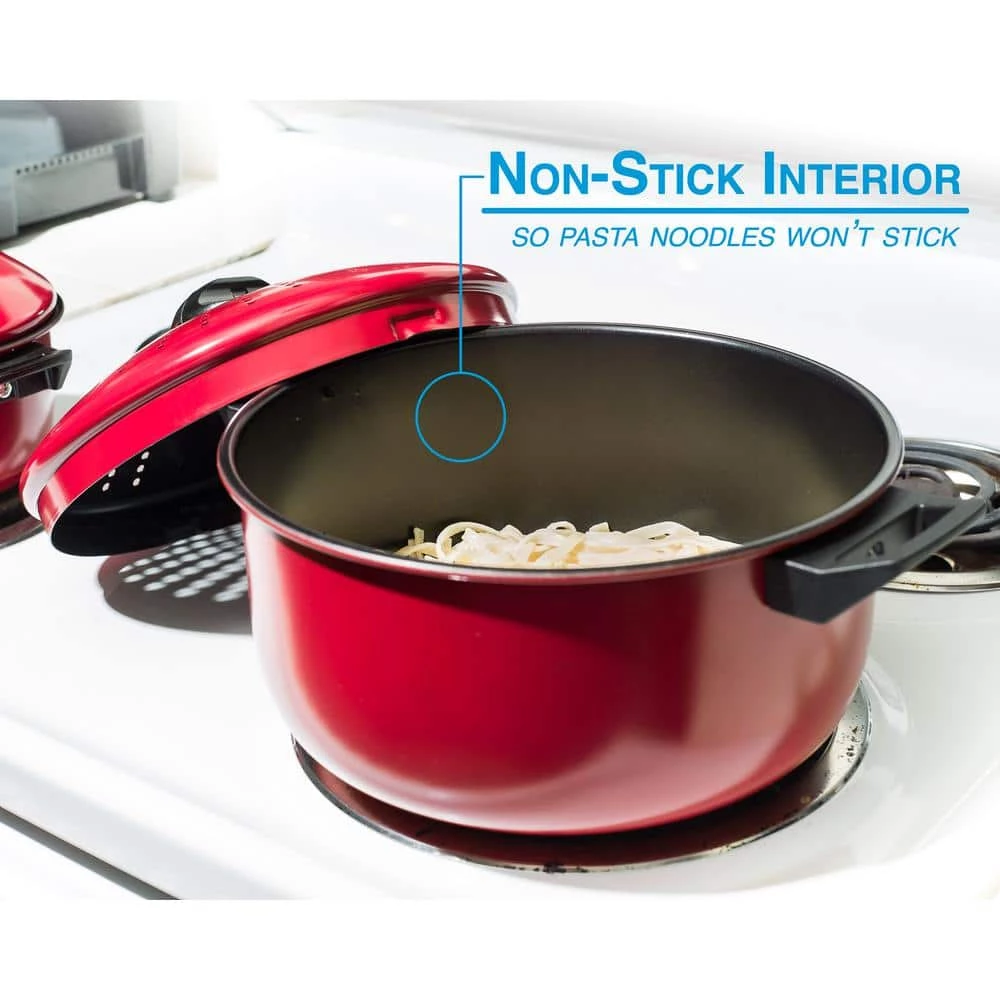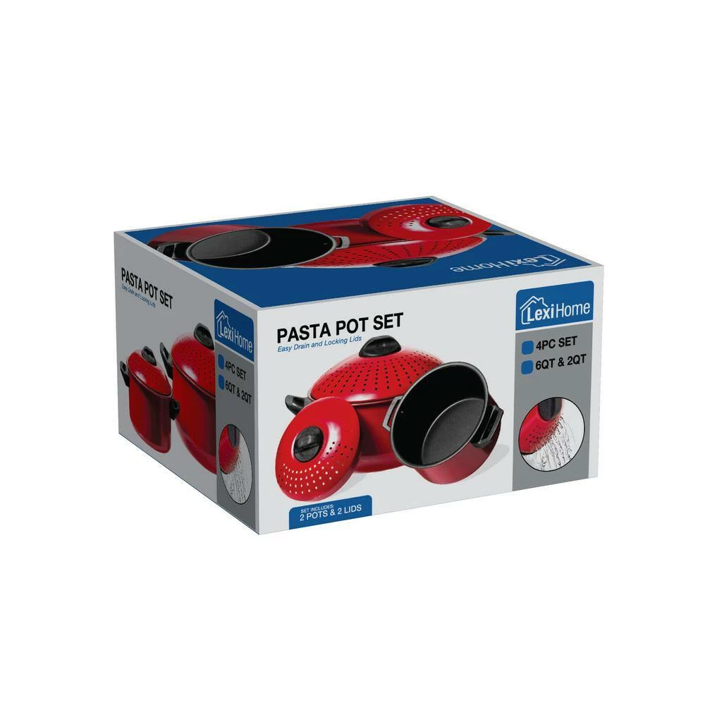 Enjoy the durable stock pot set that contain a non stick coating in the interior of carbon steel material body. The noodle pots contain a lockable straining lid for secure straining after the noodles are cooked and avoids the use of a strainer or colander. The 2-pot set includes a 4 qt. and 2 qt. stockpot which measure 7 in. Dia and 5 in. H and 10 in. Dia and 4.5 in. H.