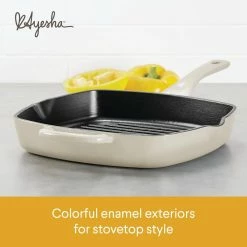 - Enameled cast iron skillet insures even heating and easy cleanup