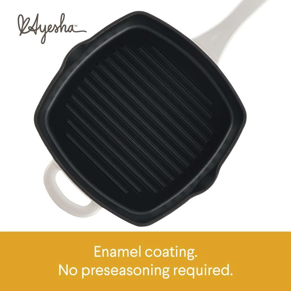 Get ready to make fun, flavorful meals and put your signature twist on traditional recipes with the Ayesha Collection 10-Inch Cast Iron Square Grill Pan. Constructed from durable, virgin ore cast iron, this grill pan is ideal for cooking on any surface including gas and induction and is perfect for searing up healthy skinless rosemary chicken breasts to pair with white cheddar mac or for pulling off Ayesha’s Easy Pan Steaks for a sophisticated mid-week feast. The cast iron body features matte black enamel on the pan’s interior for great searing and browning and a glossy metallic fleck enamel on the pan’s exterior for a modern countertop style accent. Plus, the pan’s raised edges provide plenty of room for one pot meals. A solid main handle and smaller helper handle make it practically effortless to pull together crispy, juicy pork chops and apples on the stovetop and then move them right to the oven, where the skillet is safe to 500° F, so baking and broiling come off without a hitch. Cooking juices and sauces are just as easy to manage with the grill pan’s double pour spouts. Plus, this Ayesha Curry kitchenware helps support No Kid Hungry to provide up to 500,000 meals to children in need. Learn more at nokidhungry.org/onedollar. Great meals have never been more accessible or stylish than with the Ayesha Collection Home 10-Inch Cast Iron Square Grill Pan.